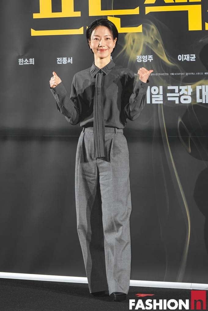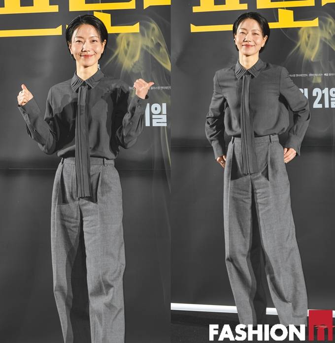 배우 김신록이 톤온톤 롱 타이 셔츠룩으로 제작발표회장의 분위기를 한껏 끌어올렸다.
