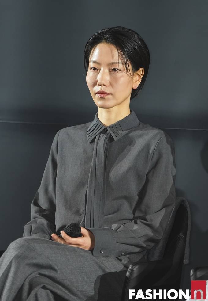 이날 김신록은 짧은 헤어 스타일에 그레이 컬러의 롱 타이 셔츠와 와이드핏 팬츠를 착용한 톤온톤룩으로 시크하면서도 여성스러운 스타일을 선보였다.