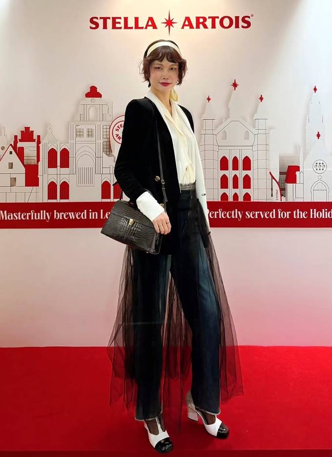 공개한 사진에서 송경아는 데님 팬츠 위에 블랙 시스루 스커트를 입고 화이트 블라우스 위에 블랙 재킷을 걸친 다이닝룩으로 우아하면서도 큐티한 스타일을 선보였다.