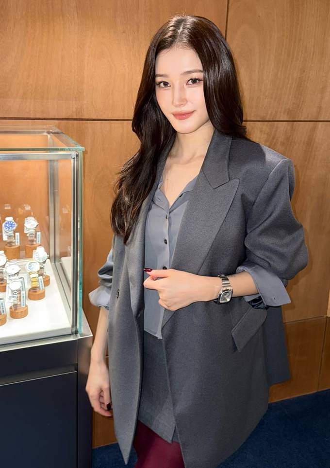 공개한 사진에서 낸시는 넉넉한 핏의 오버핏 그레이 슈트 재킷에 동일한 톤의 셔츠와 초미니 스커트를 매치한 하의실종 스타일의 슈트룩을 선보였다.