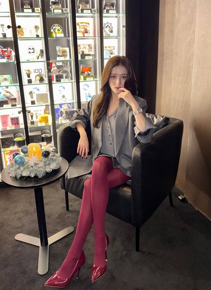 또 여기에 와인 컬러의 스타킹과 하이힐을 매치해 하의실종룩을 더욱 돋보이게 했다.