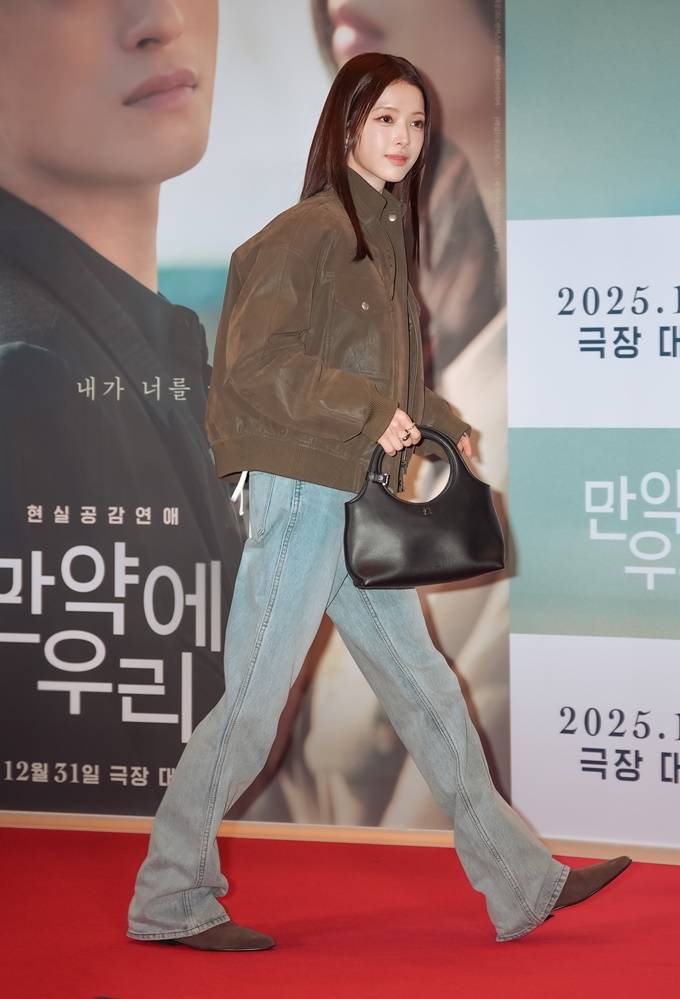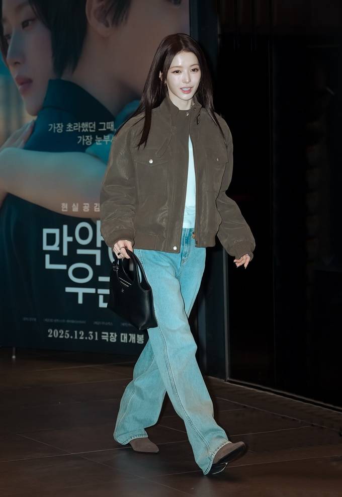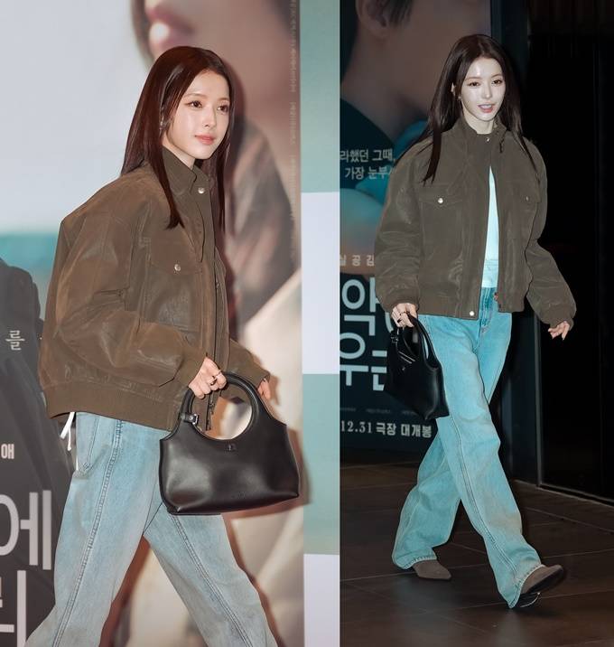 배우 노정의가 봄버 재킷과 청바지를 매치한 스타일리시한 시사회룩으로 눈부신 미모를 빛냈다.