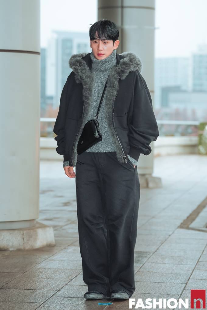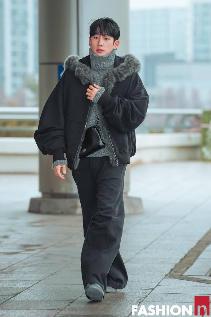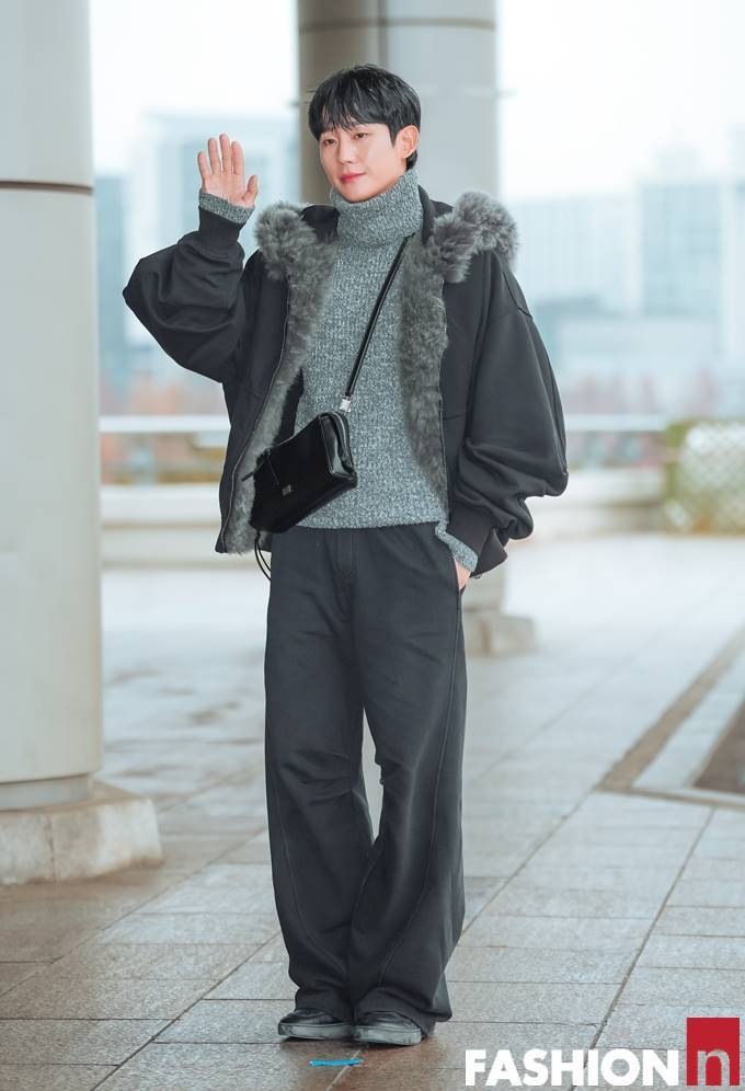 이날 정해인은 블랙 퍼 재킷에 이너로 그레이 터틀넥 니트 스웨터를 입고 와이드 블랙 팬츠를 매치한 톤온톤 스타일로 로맨틱하면서도 훈훈한 출국룩을 선보였다.