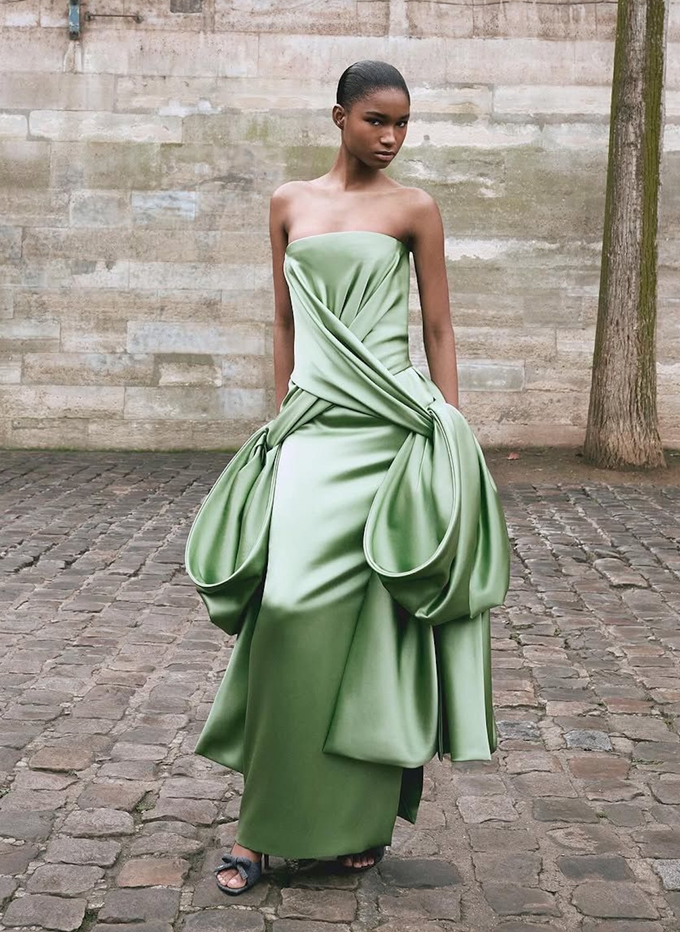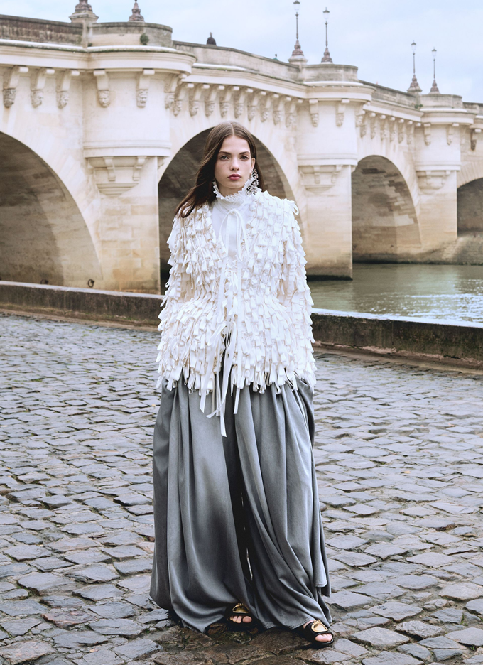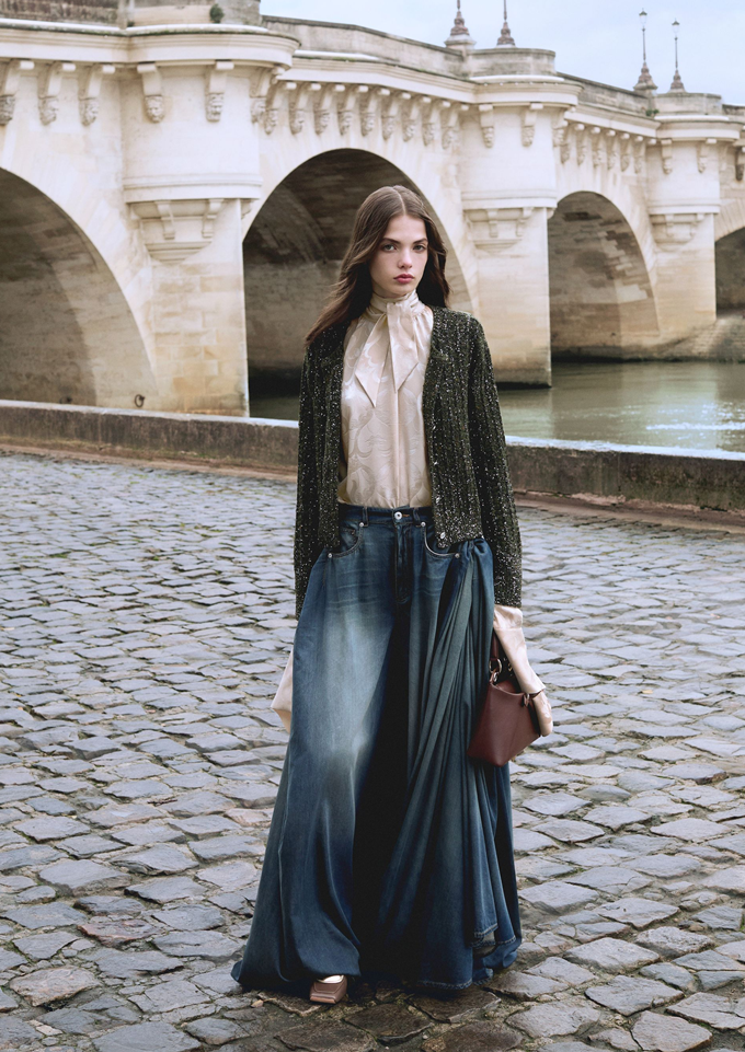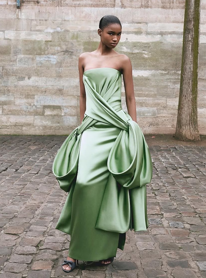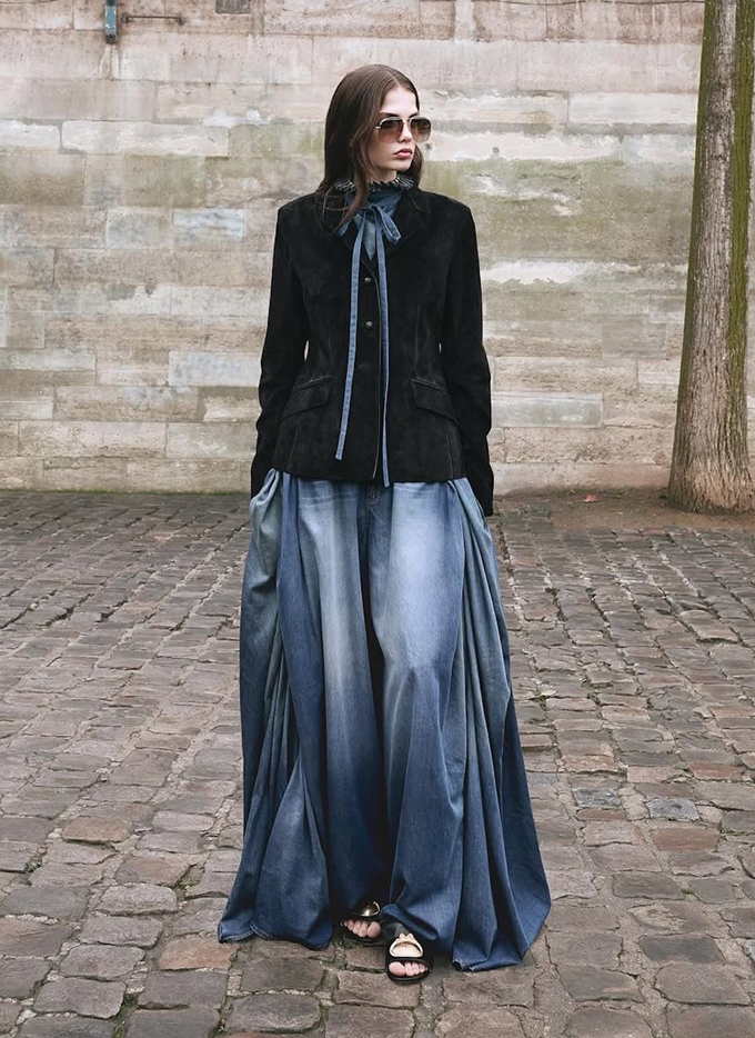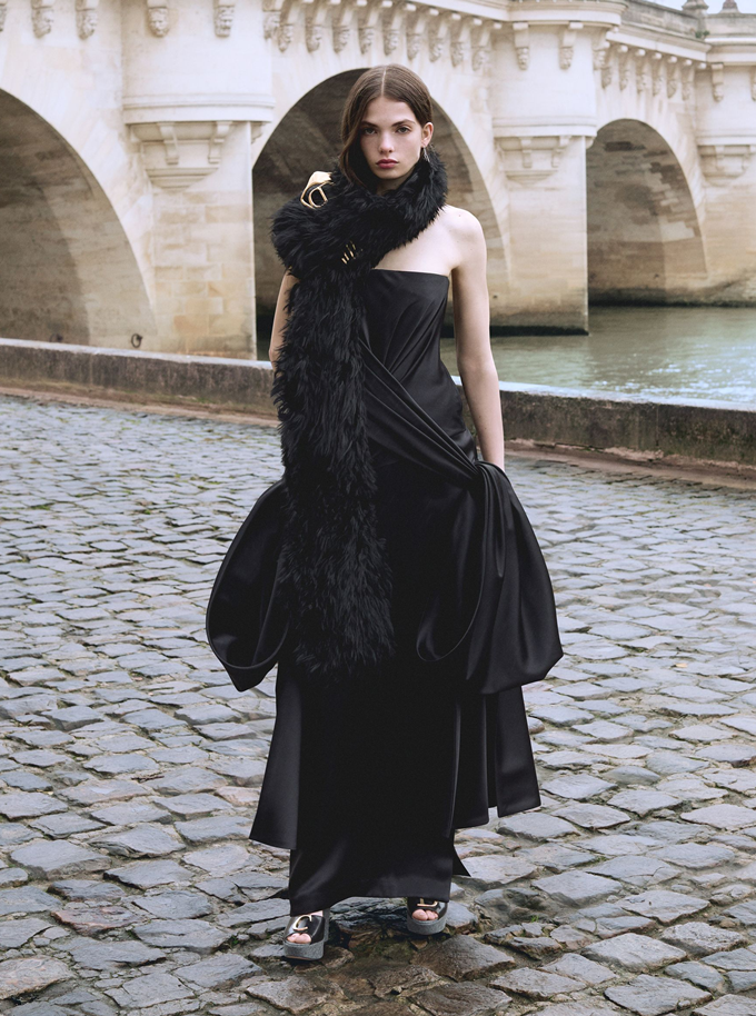 부드럽거나 크롭된 형태, 혹은 코트 크기로 확장된 바 재킷을 비롯해 몸을 감싸는 여유로운 코트, 니트 케이프, 드레이프 드레스, 와이드 실크 데님 팬츠, 측면의 극적인 볼륨이 돋보이는 조각적인 드레스가 컬렉션의 핵심을 이룬다.