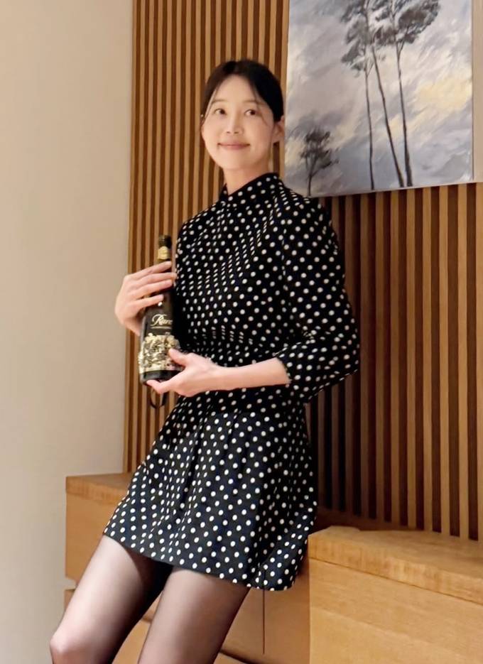 공개한 사진에서 한지혜는 땡땡이 도트 미니 원피스에 블랙 스타킹을 매치한 스타일로 늘씬한 실루엣 라인을 자랑했다.