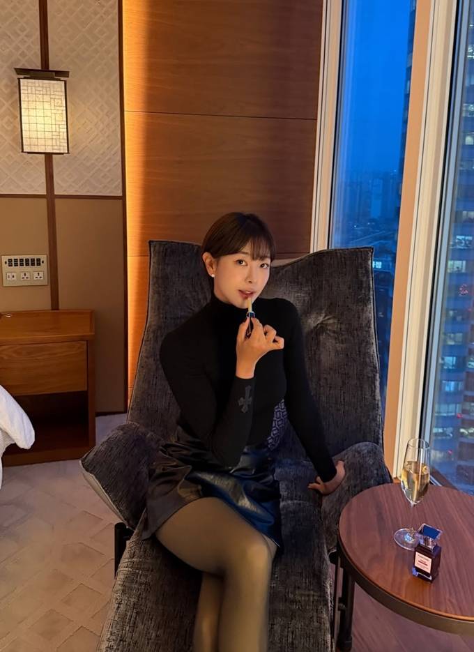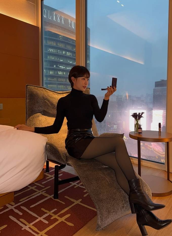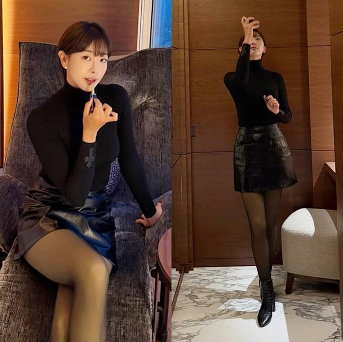 공개한 사진에서 고원희는 블랙 터틀넥 톱에 레더 스커트를 매치한 톤온톤 스타일의 시크한 실루엣로 미니멀 블랙룩을 완성했다.