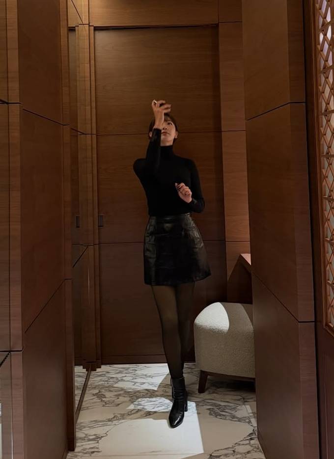 배우 고원희가 블랙 터틀넥에 블랙 레더 스커트를 매치해 미니멀 블랙룩의 진수를 선보였다.