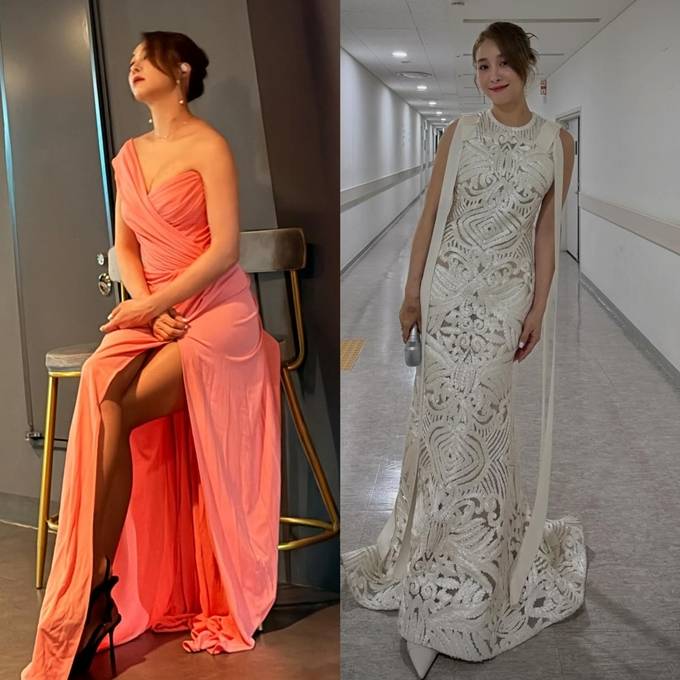 또 탄탄한 몸매가 돋보이는 부드러운 드레이핑과 깊게 트인 슬릿 디테일의 코랄 핑크 하이슬릿 원숄더 드레스룩으로 관능적이면서도 우아한 무드를 자아냈다.