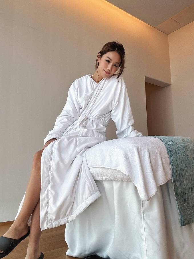 공개한 사진에서 김희정은 올려묶은 헤어 스타일에 블랙 벨트로 허리 라인을 강조한 스트라이프 화이트 홈 가운 호캉스룩으로 오사카 호텔에서 여유로운 시간을 갖는 모습을 드러냈다.