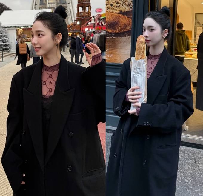 에스파 카리나, 파리에서 오버핏 얼죽코! 바게트와 찰떡 롱 코트 프렌치 시크룩