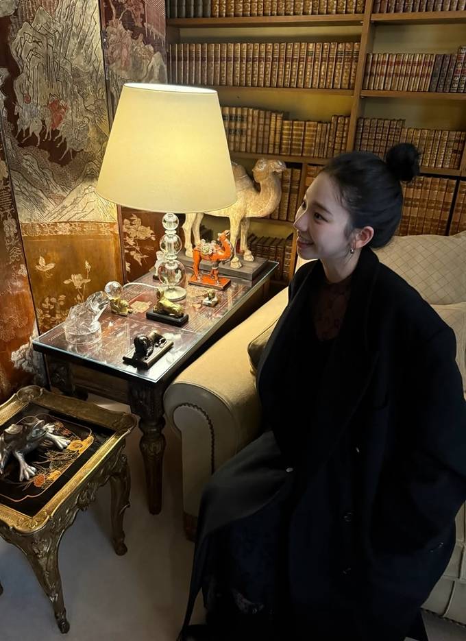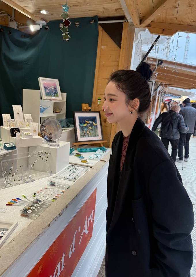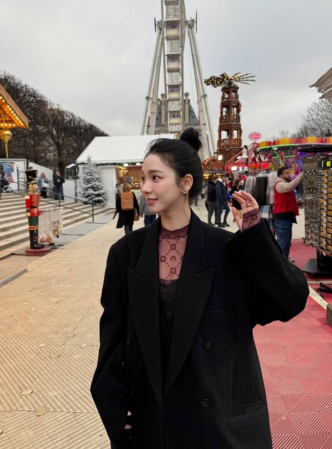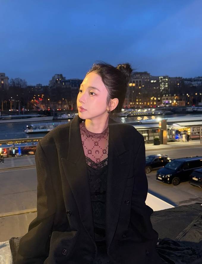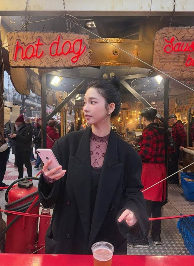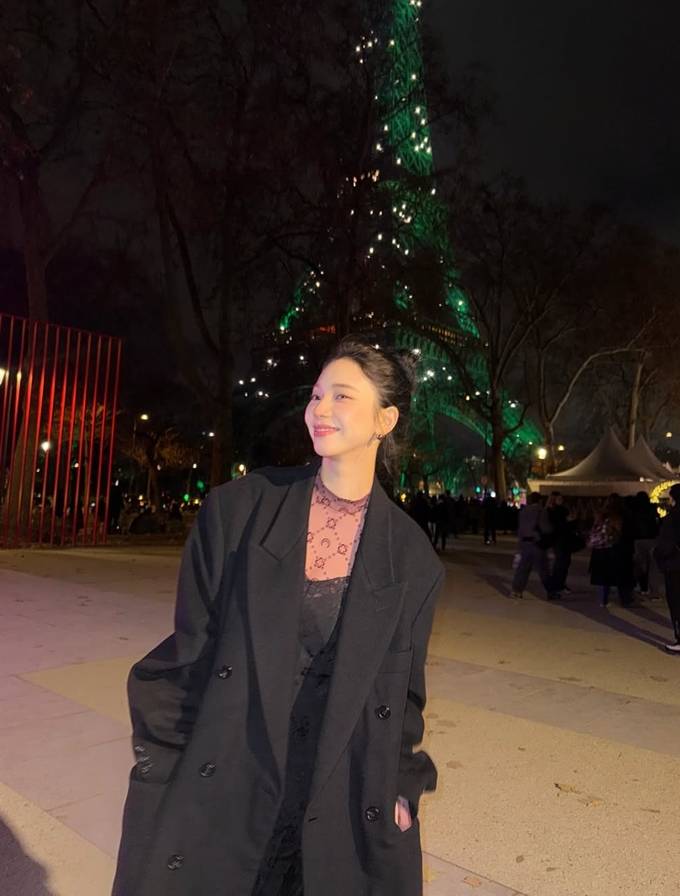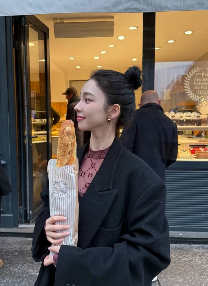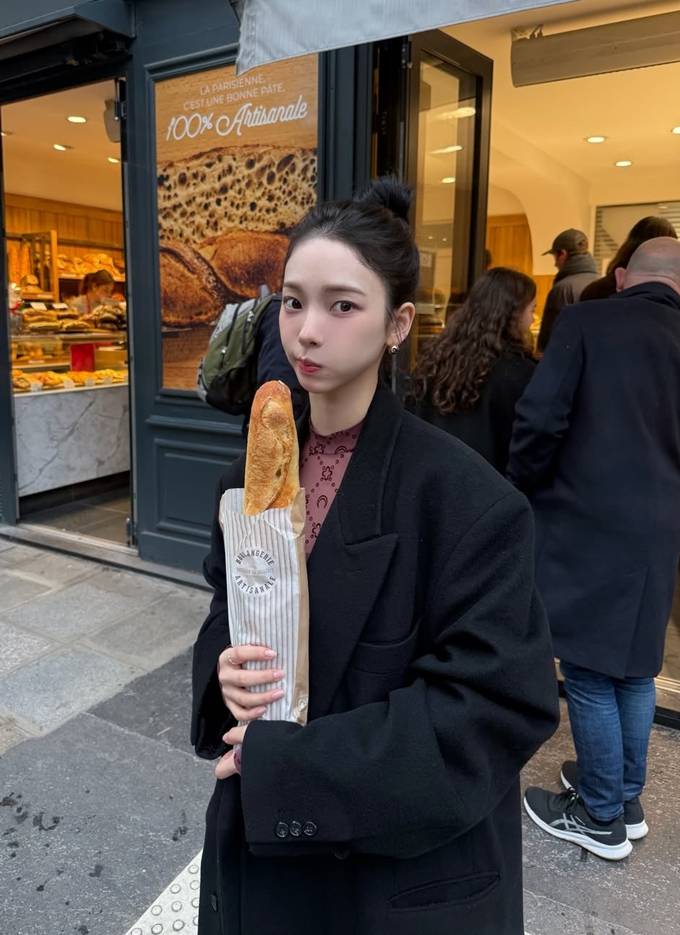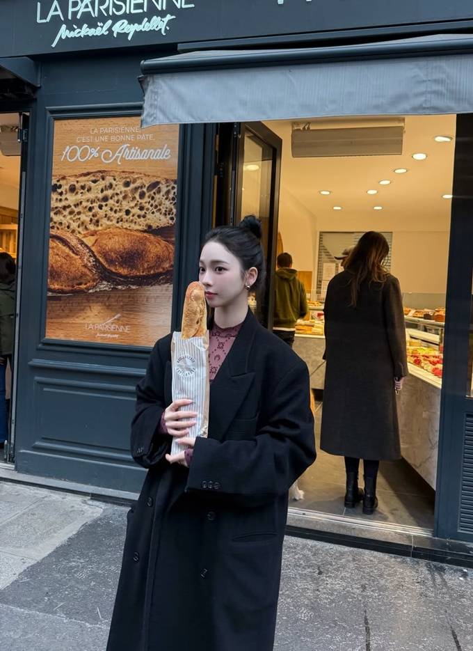 그룹 에스파의 카리나가 파리에서 바게트를 손에 든 롱 코트 프렌치 시크룩으로 멋스러운 스타일을 선보였다.
