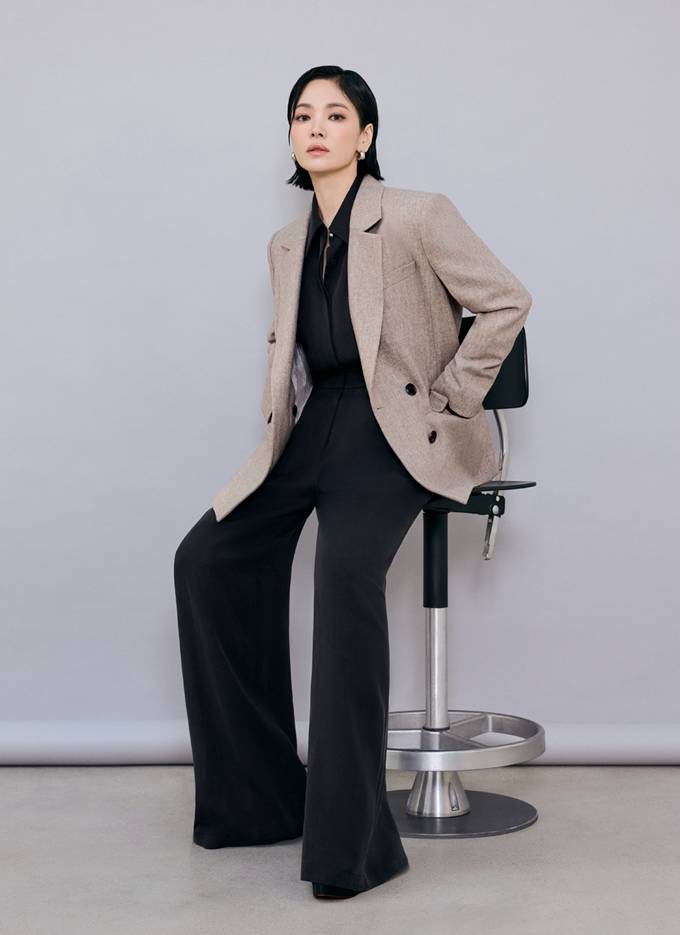 화보 속 송혜교는 베이지 컬러의 롱코트를 착용해 클래식한 우아함을 연출하는가 하면, 구조적인 더블 브레스티드 재킷과 유연한 실루엣의 블라우스, 와이드 팬츠를 매치해 세련된 시크 무드를 완성했다.