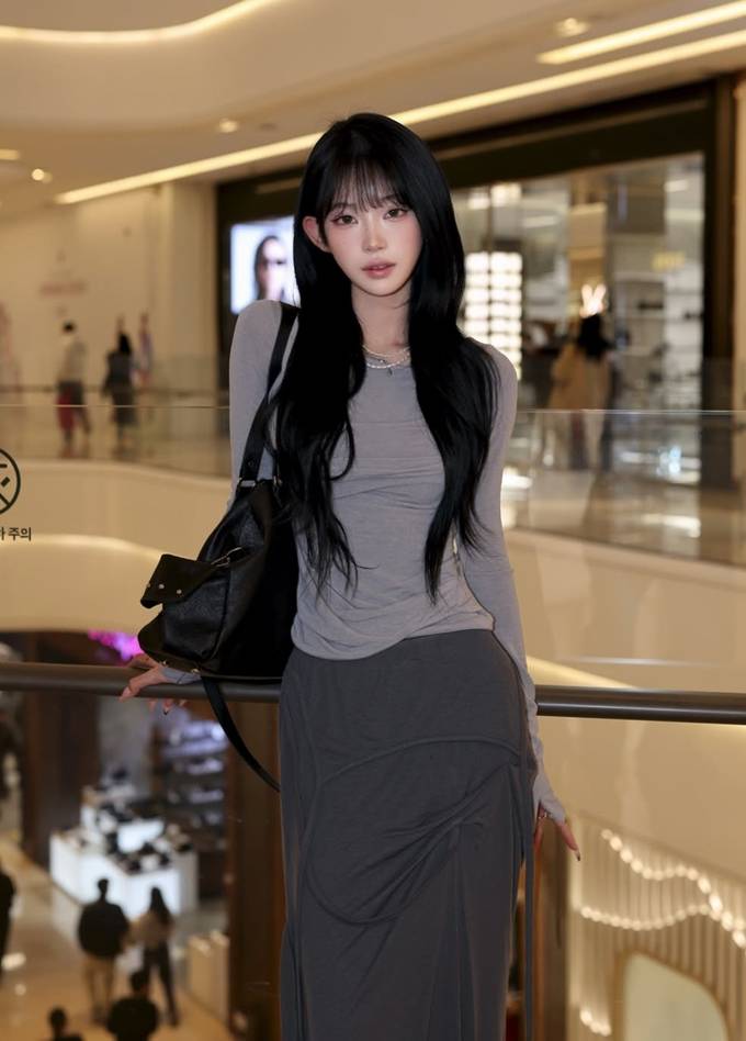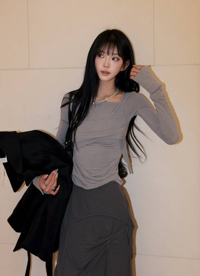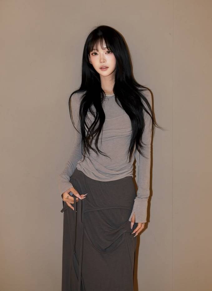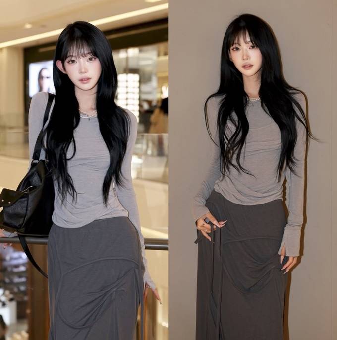 공개한 사진에서 최진희는 가녀린 실루엣이 드러난 그레이 롱 스커트와 톱을 착용한 톤온톤 스타일로 소녀 같은 동안 미모를 드러냈다.