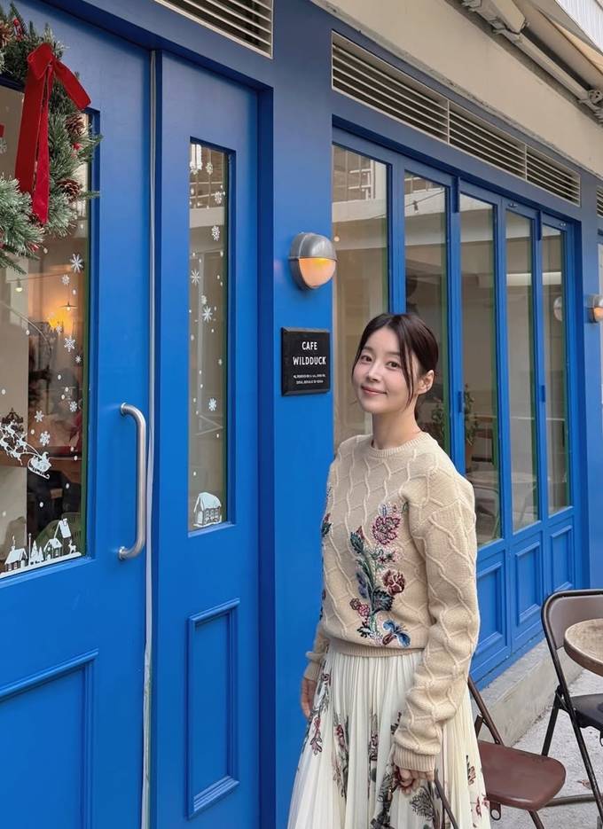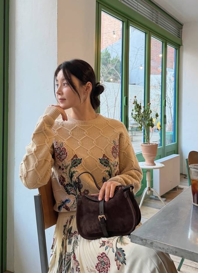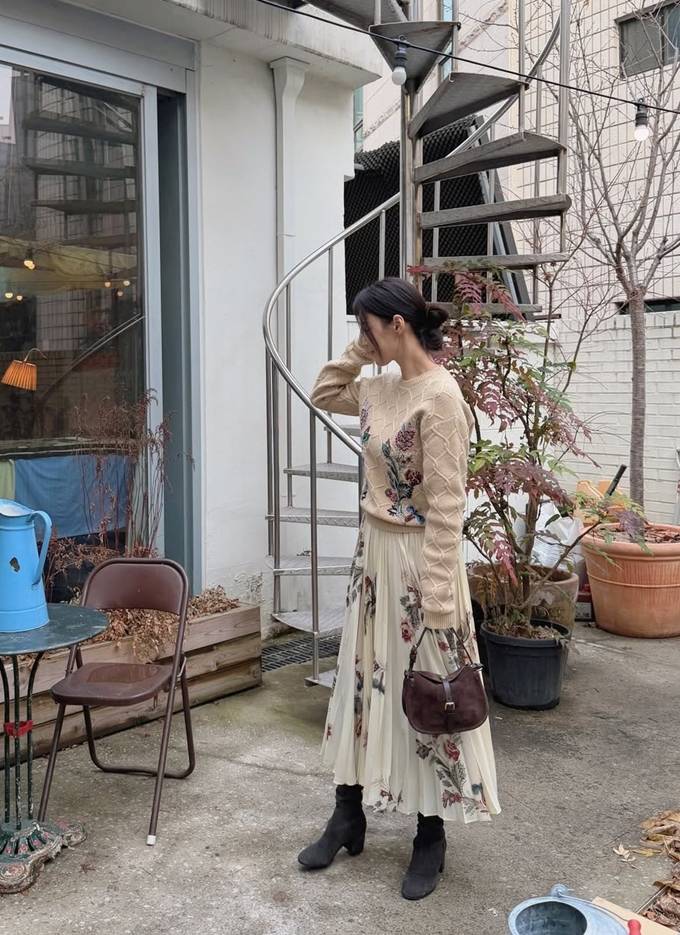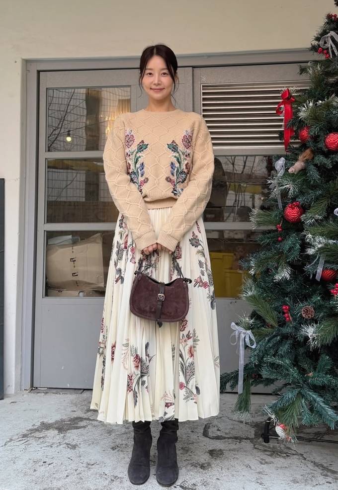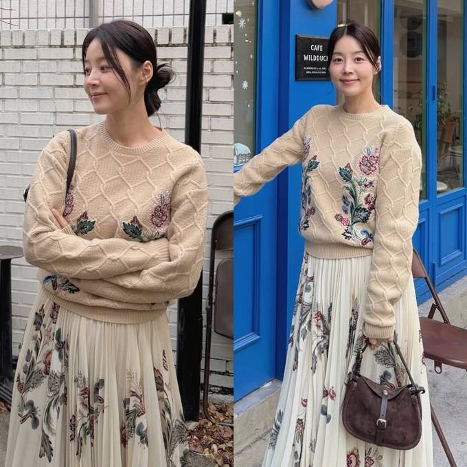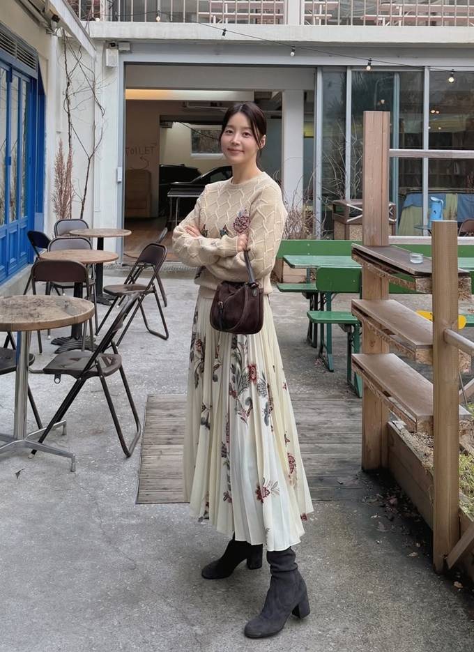 한지혜, 4살 딸 엄마의 러블리! 꽃무늬 니트와 플리츠 스커트 러블리 윈터 데일리룩