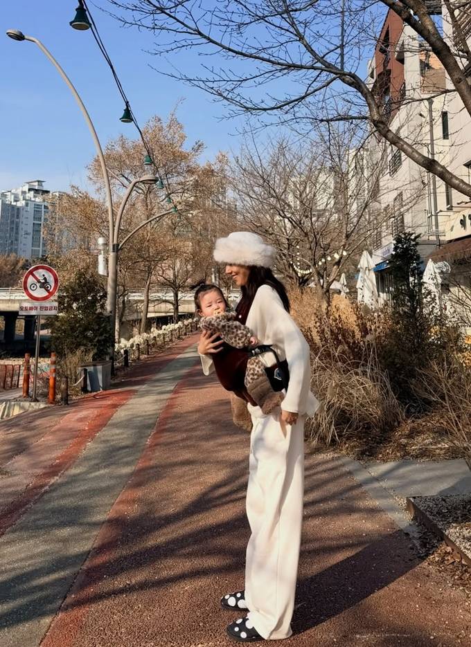 또한 9개월된 딸 해이는 표범 무늬 우주복에 털 신발을 착용한 스타일로 엄마 커플 산책룩을 완성했다.