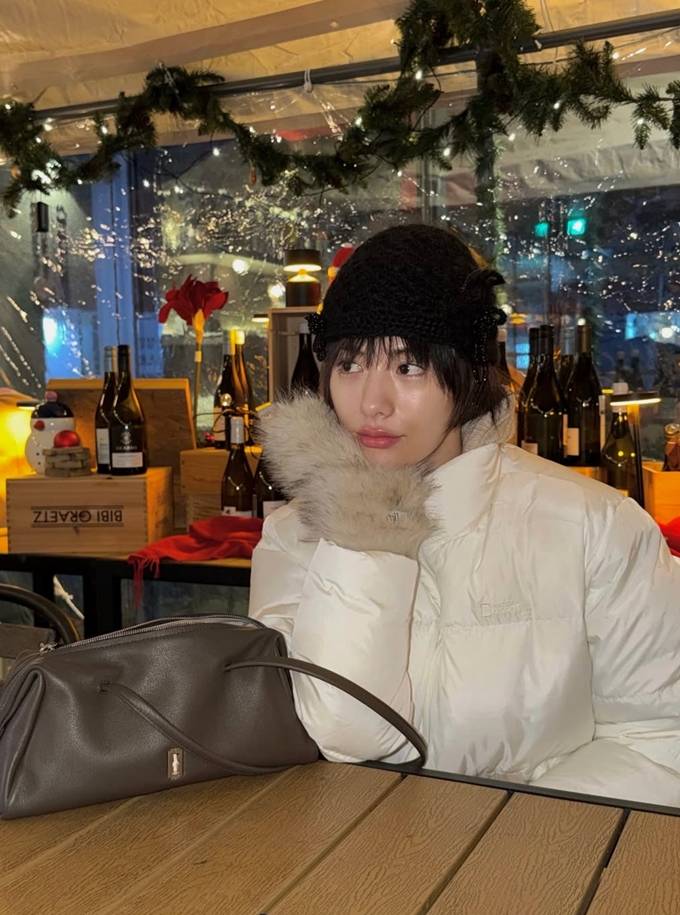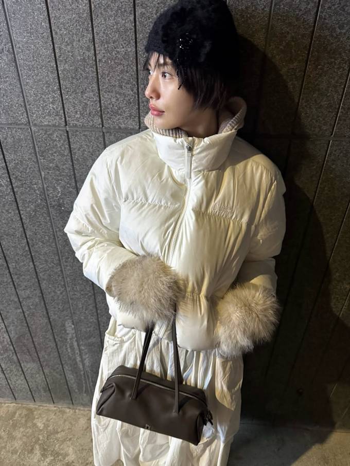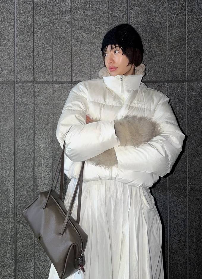 공개한 사진에서 나나는 화이트&화이트 스타일에 블랙으로 마침표를 찍은 멋스러운 겨울 스타일링으로 숏패딩의 진수를 선보였다.