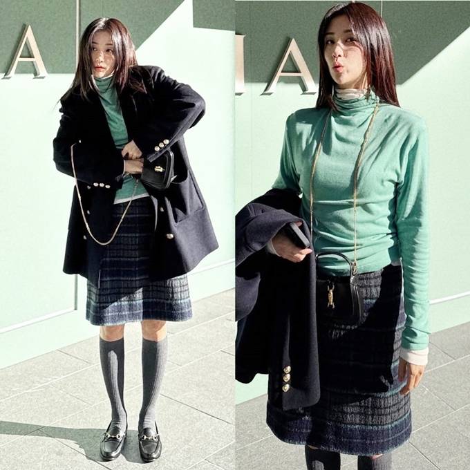 공개한 사진에서 박하선은 차분한 체크 스커트에 생기 넘치는 그린 터틀넥을 입고 지적인 블랙 코트를 매치한 프레피룩으로 단정하면서도 밝은 프렌치걸 같은 분위기를 자아냈다.