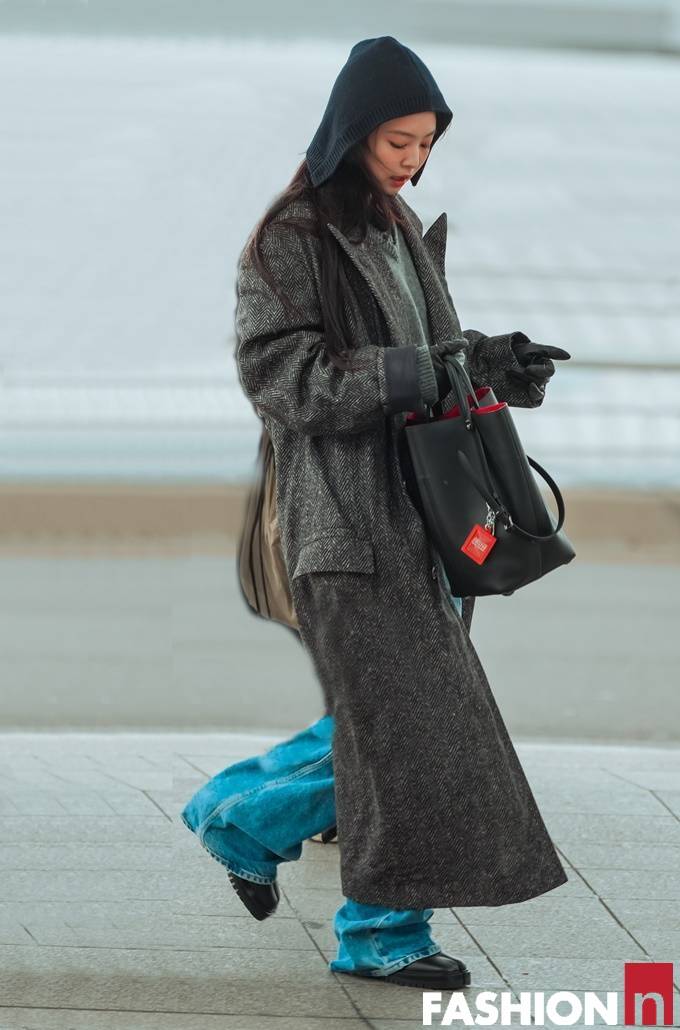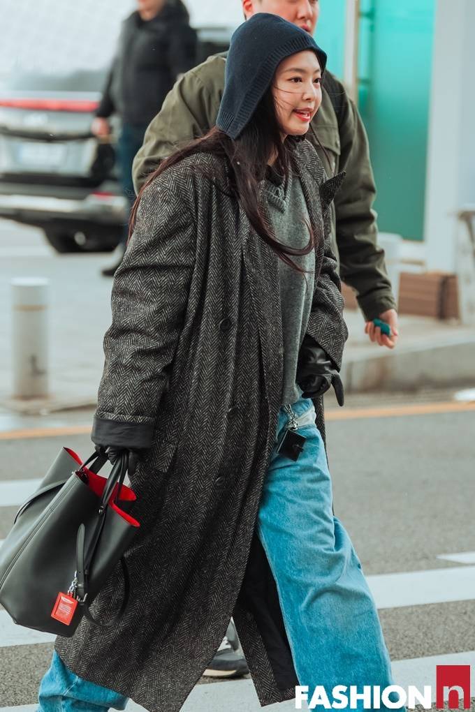 이날 제니는 헤링본 패턴의 맥시 코트 여기에 비니와 청바지를 더한 스타일리시한 겨울 데일리룩으로 패션센스를 발산했다.