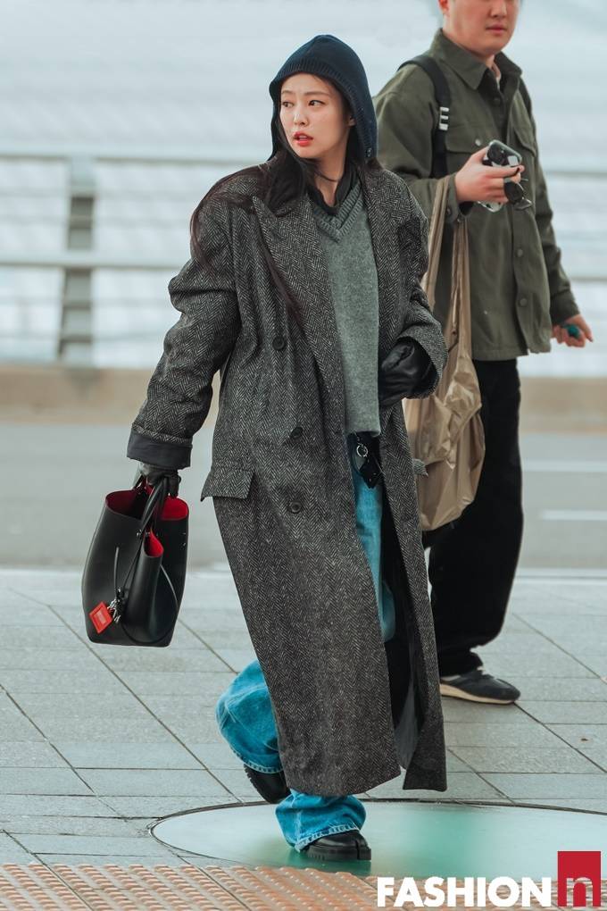 [패션엔 포토] 블랙핑크 제니, 비니와 딱! 바닥을 휩쓴 헤링본 맥시 코트룩 대만 출국
