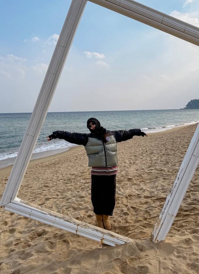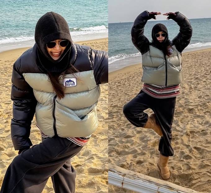 배우 채정안이 바라클라바로 꽁꽁 두르고 두꺼운 숏패딩으로 완전무장한 여행룩으로 바닷가 낭만을 즐겼다.