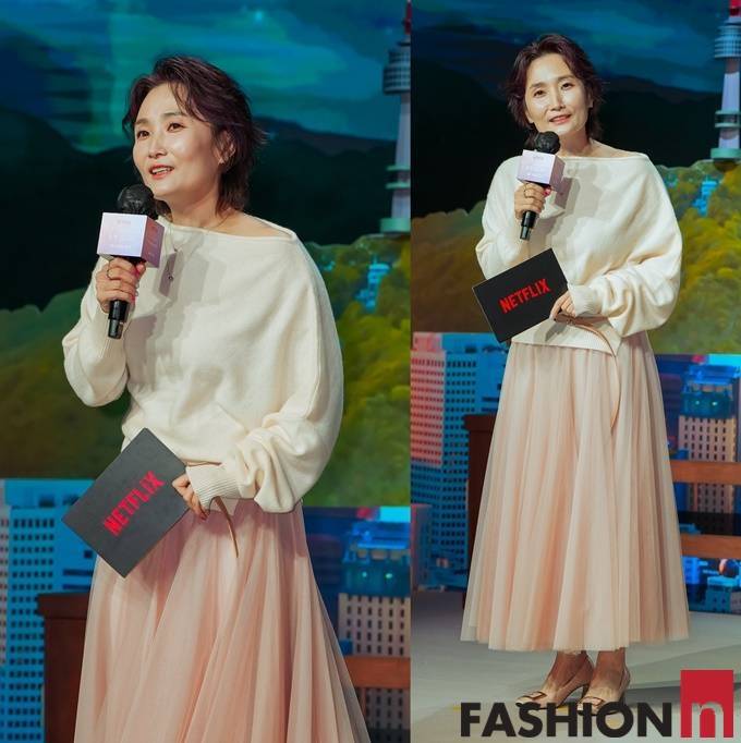 이날 박경림은 오버핏 티셔츠와 풍성한 샤 스커트가 눈에 띄는 우아한 발레코어룩으로 산뜻한 스타일을 연출했다.