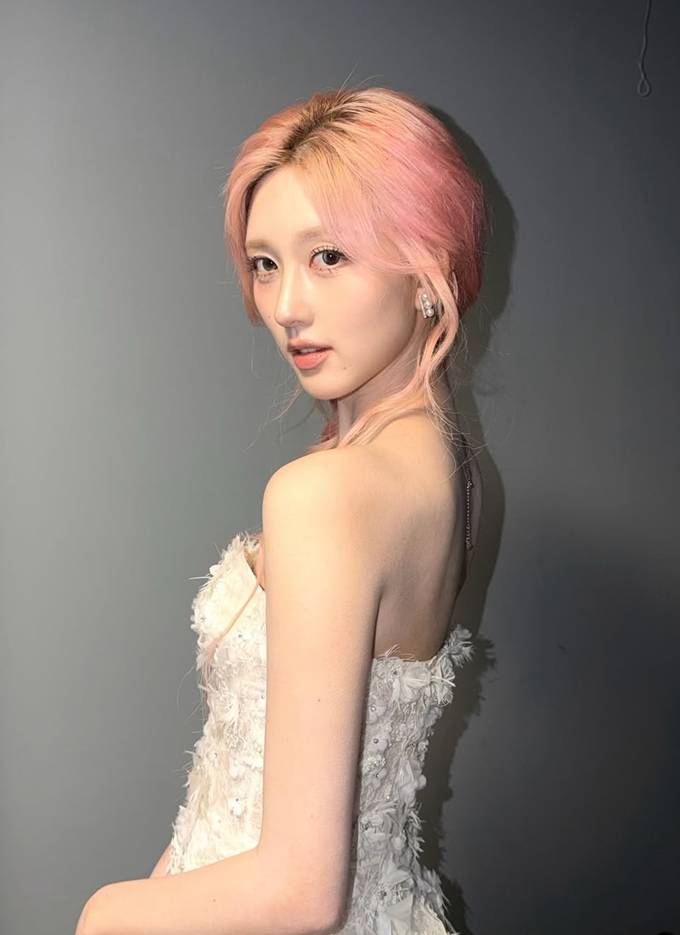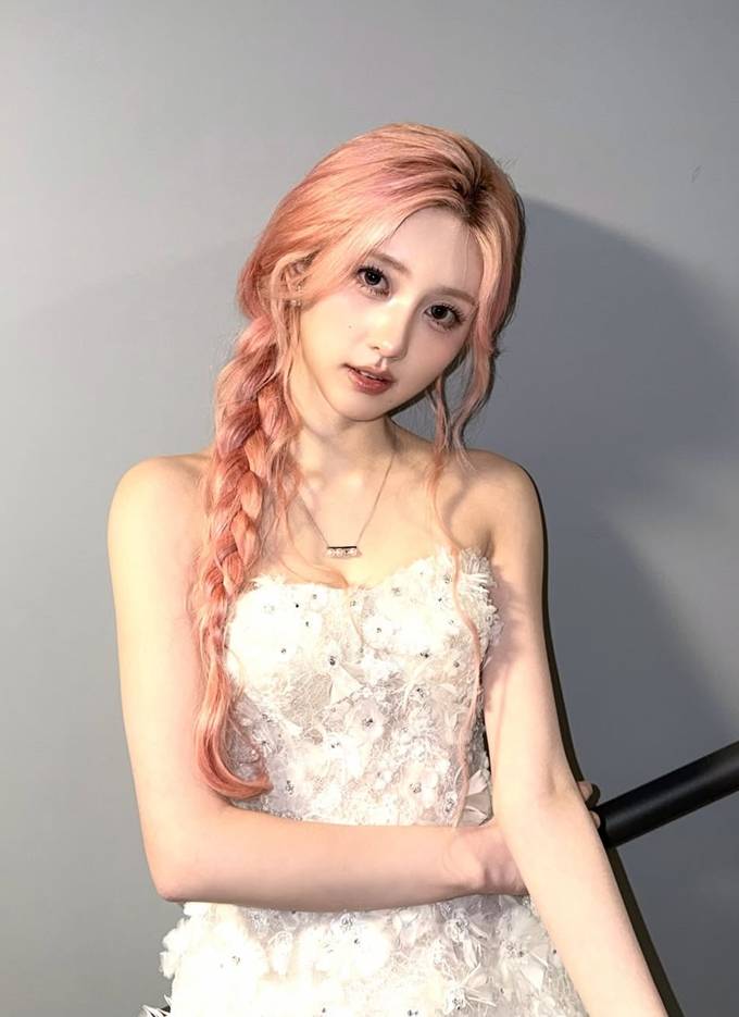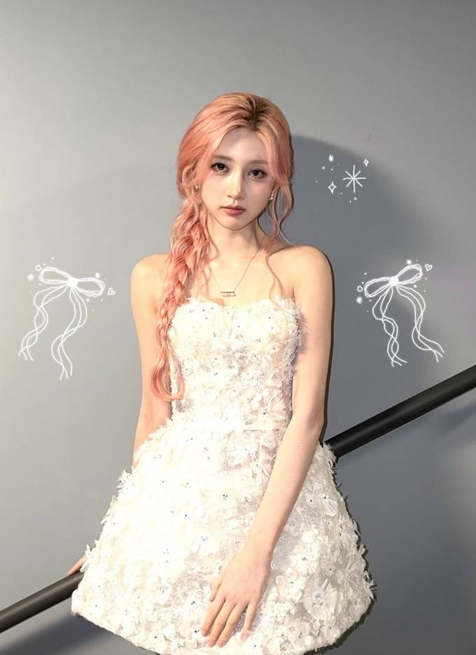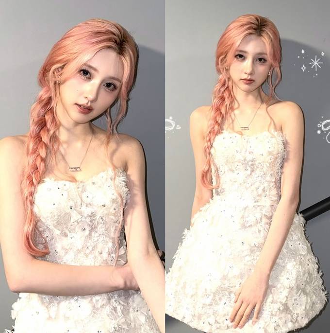 공개한 사진에서 가을은 연한 핑크빛 헤어를 길게 땋아 내린 스타일에 플라워 디테일이 풍성하게 장식된 요정 같은 실루엣의 화이트 튜브 톱 드레스룩으로 동화적인 분위기를 연출했다.