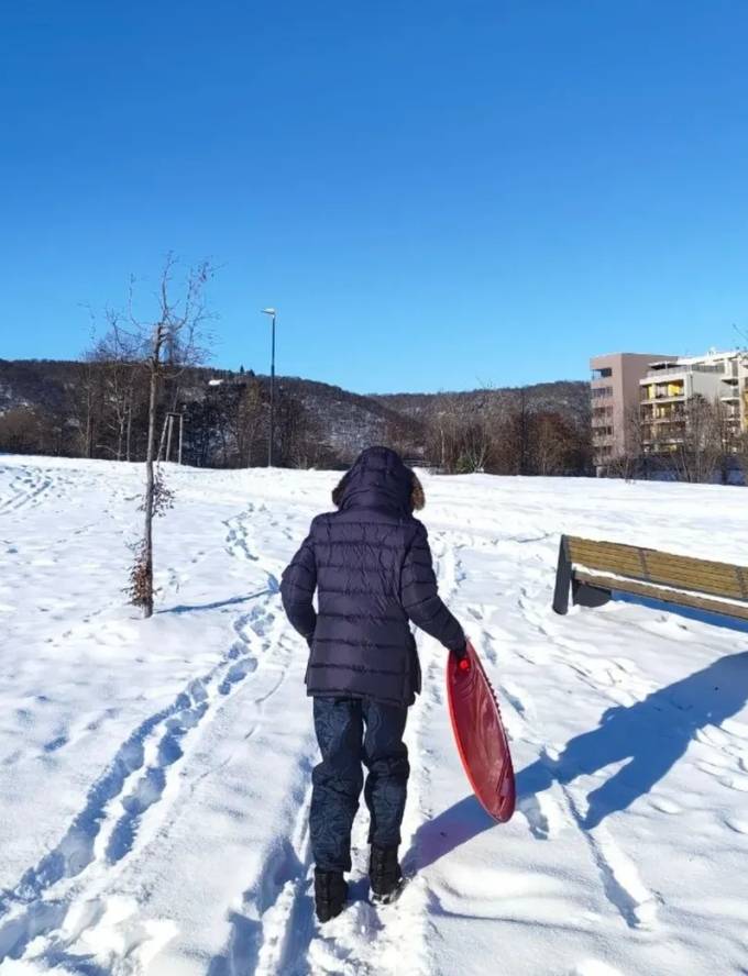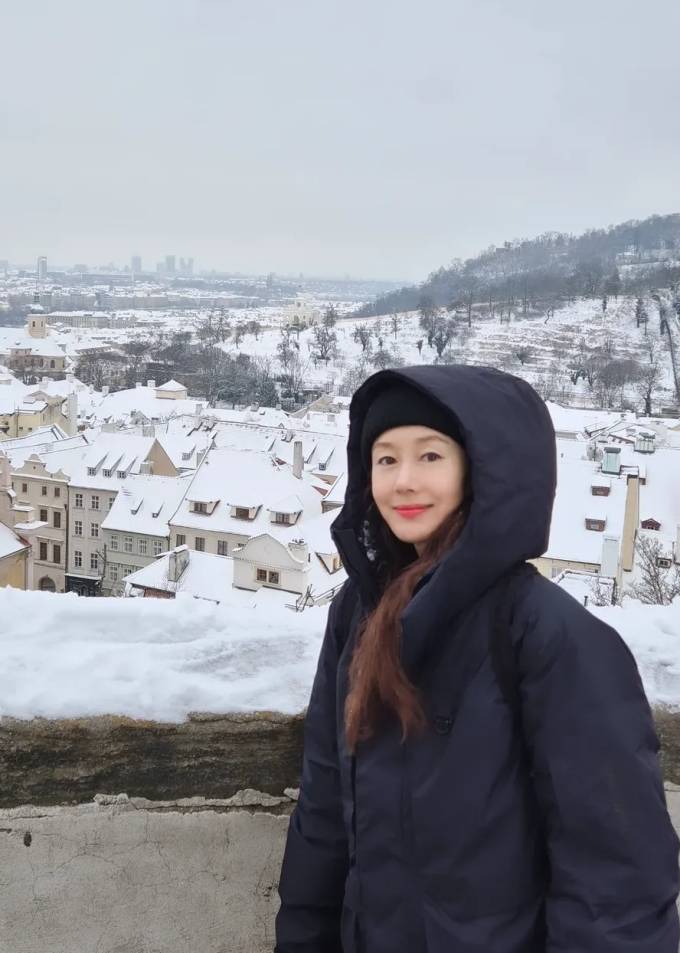 배우 김지수가 체코 프라하에서 후드 패딩룩으로 눈썰매를 즐겼다.