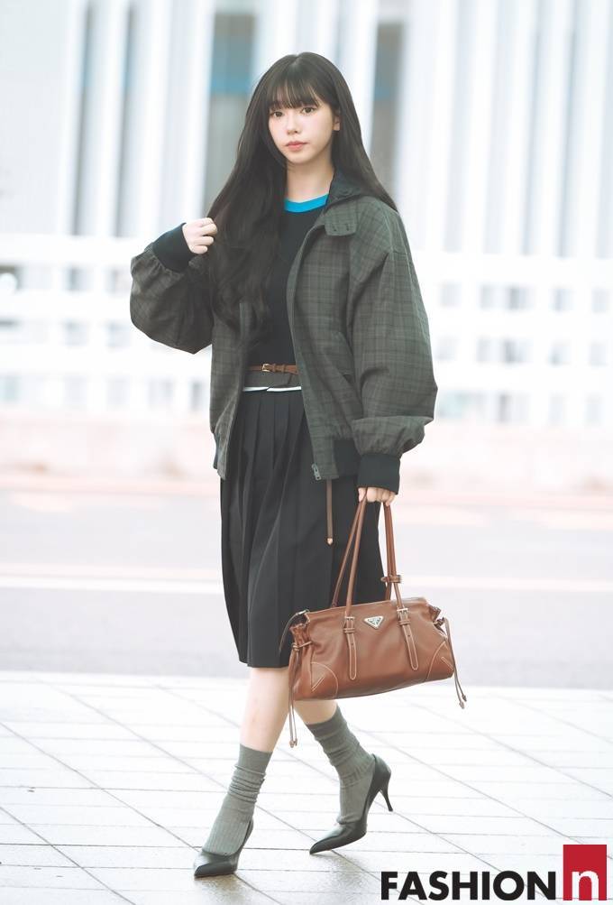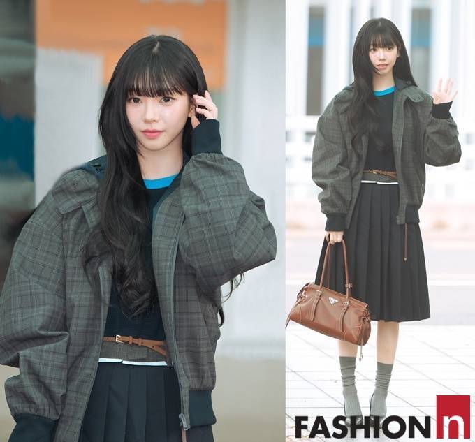 이날 카리나는 체크 무늬 봄버 재킷과 플리츠 스커트를 매치한 여성스러운 스쿨룩으로 화제를 모았다.