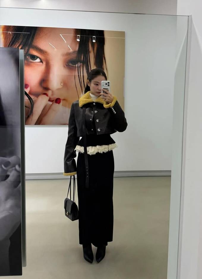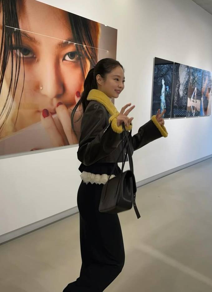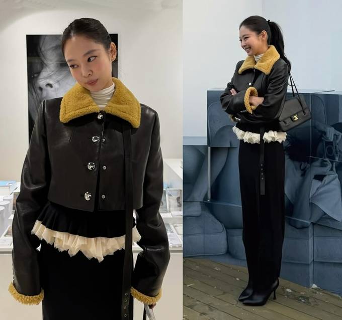 현장을 찾은 제니는 하이넥 퍼 카라 벨트가 멋스러운 크롭 레더 재킷을 입고 럭셔리하면서도 세련된 전시회룩을 선보였다.