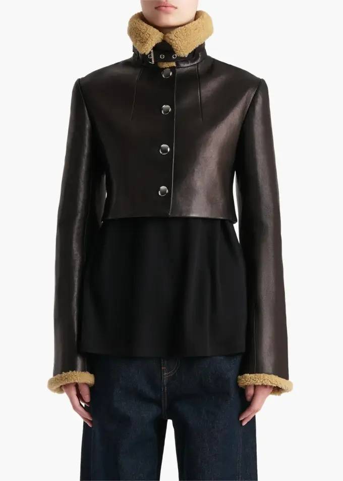 이 제품은 거칠고 세련된 디테일이 돋보이는 크롭 가죽 재킷으로 플루트가 있는 긴 소매에 벨트가 달린 스탠드 카라와 커프스의 시어링 소재가 특징이다.