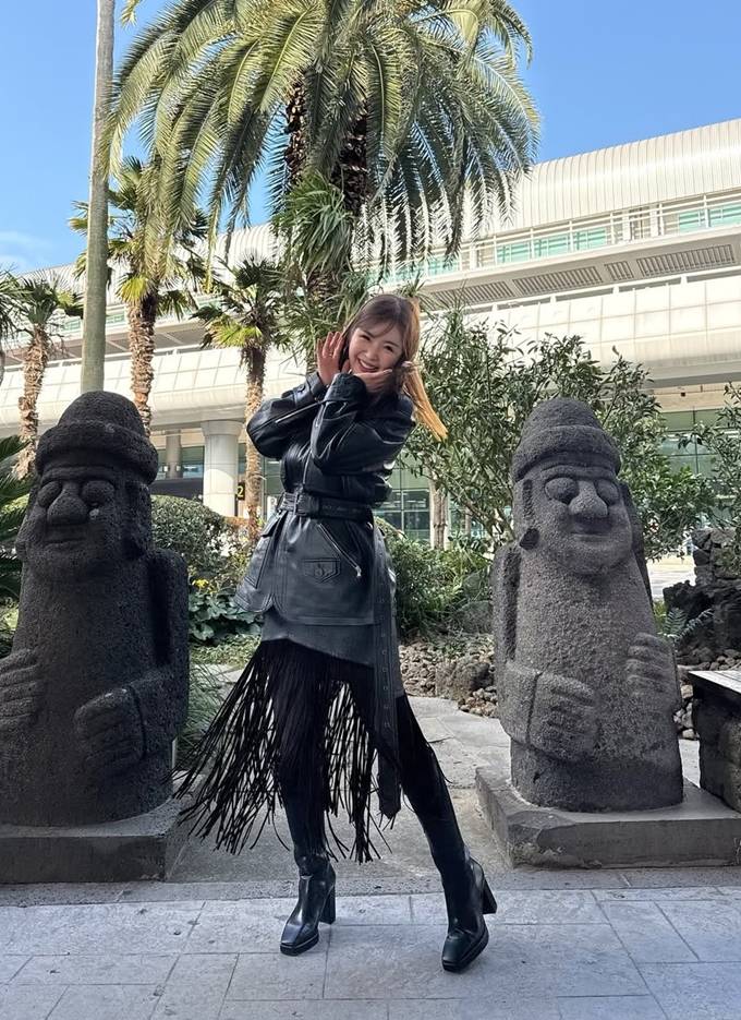 공개한 사진에서 장영란은 과감한 블랙 프린지 스커트에 블랙 벨티트 레저 재킷을 매치한 올 블랙 스타일로 힙하면서도 핫한 출장룩을 선보였다.