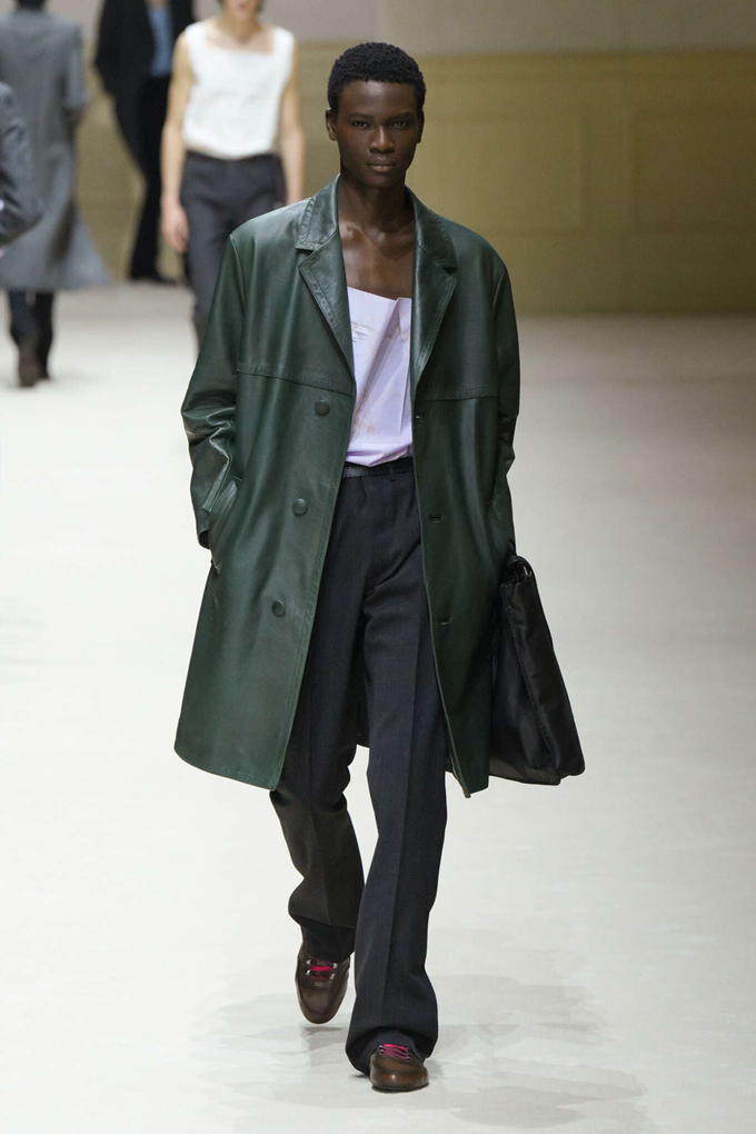 세련되고 아름다운 드레이핑이 돋보이는 니트웨어부터 드라마틱하고 슬림한 코트까지, 프라다 특유의 당당함과 세련미가 모든 룩에 깃들이 있으며, 익숙한 틀을 깨트린 신선한 하이브리드 조합은 새로운 감각의 결과물로 이어졌다.