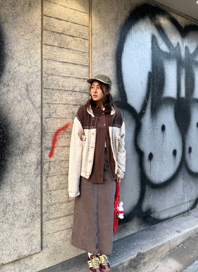 카키 컬러의 볼캡을 더해 캐주얼한 스트리트 감성을 강조했고, 레드 컬러의 토트백으로 포인트를 주며 전체 룩에 생기를 불어넣었다.