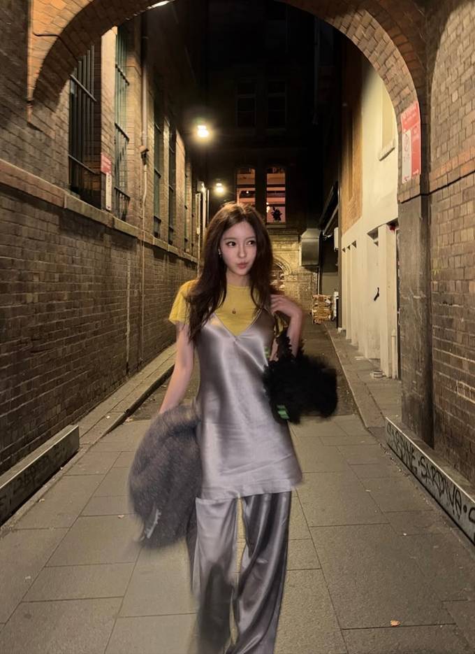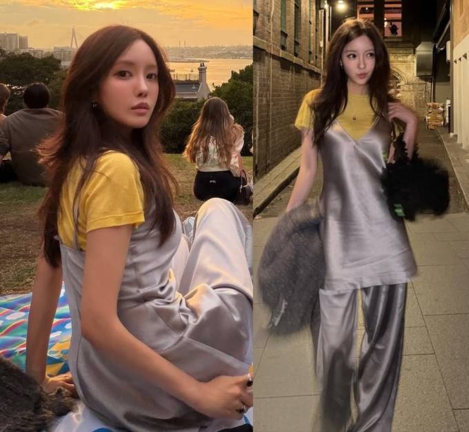 가수 효민이 호주 시드니에서 로맨틱한 실크 슬립 뷔스티에 피크닉룩으로 저녁 노을을 즐겼다.