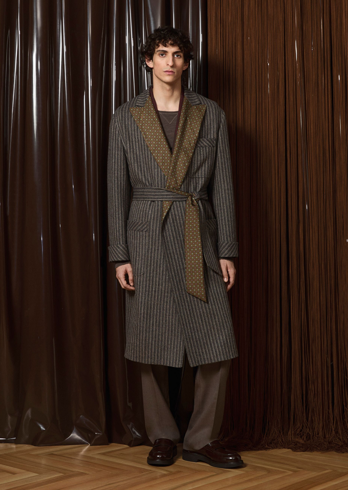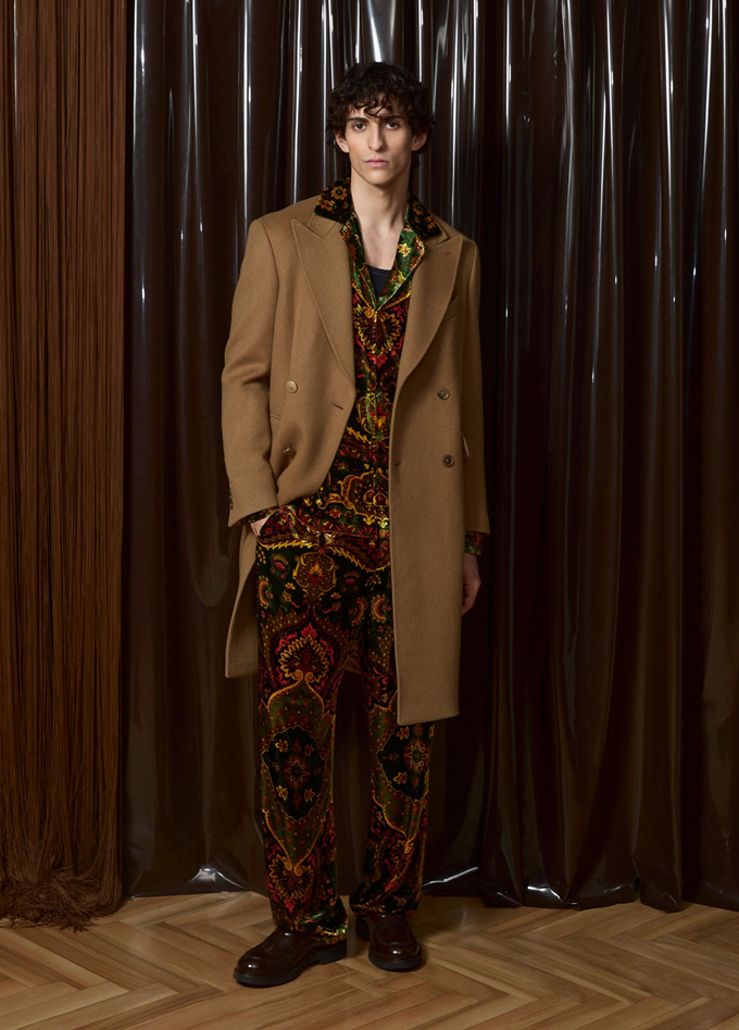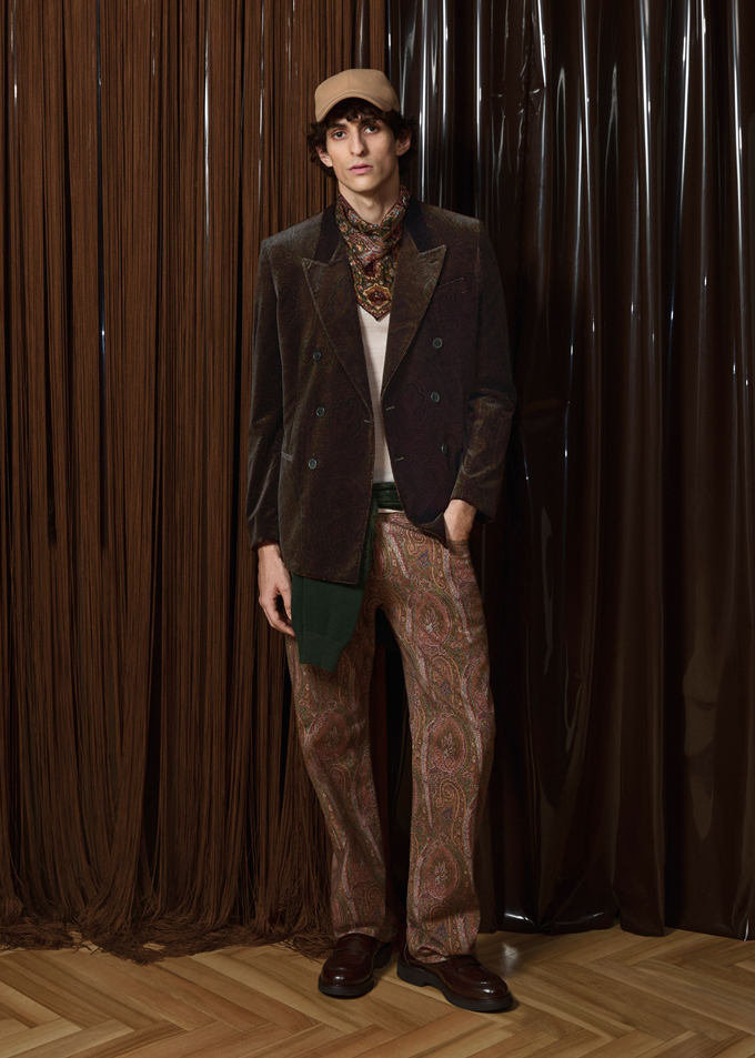 벨벳 위에 프린트된 페이즐리 모티프 패턴이 풍성하게 펼쳐지고, 로브와 파자마는 실내와 실외의 경계를 허물며 스타일링된다.