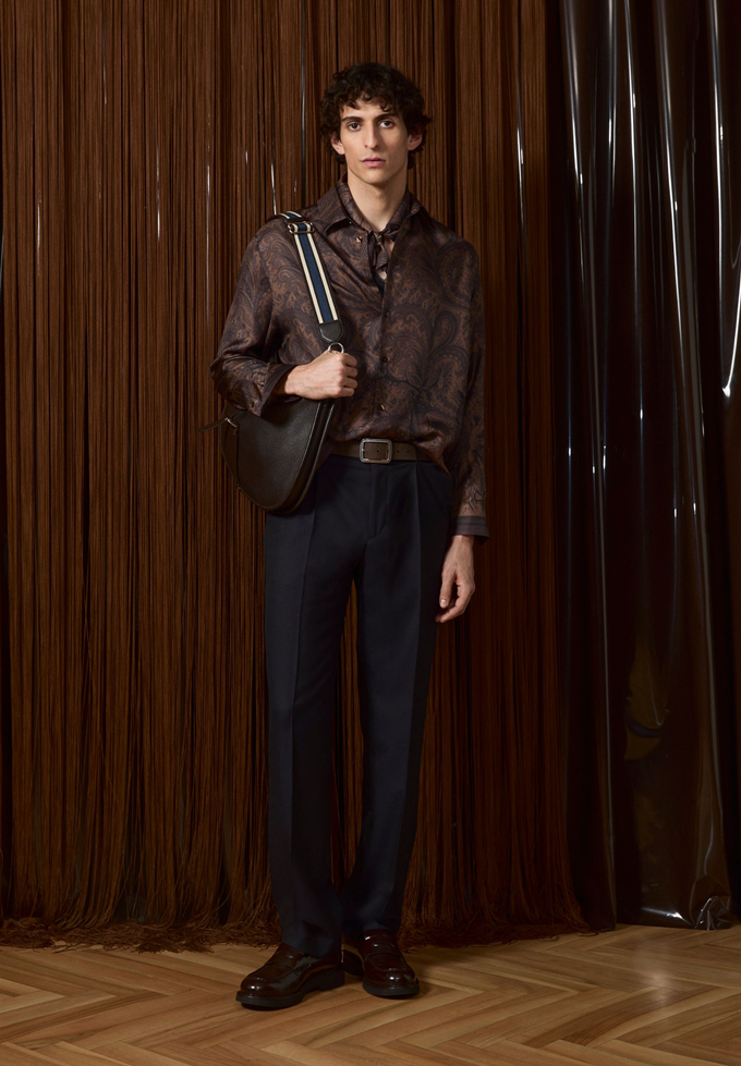 페이즐리는 팬츠와 스카프, 로브 코트 전반에 걸쳐 확장되며 컬렉션에 에트로 특유의 정체성을 더한다. 허리에 묶은 스웨터, 부드럽고 여유로운 볼륨감의 백, 깊게 눌러쓴 캡은 자연스럽고 캐주얼한 태도를 완성한다.