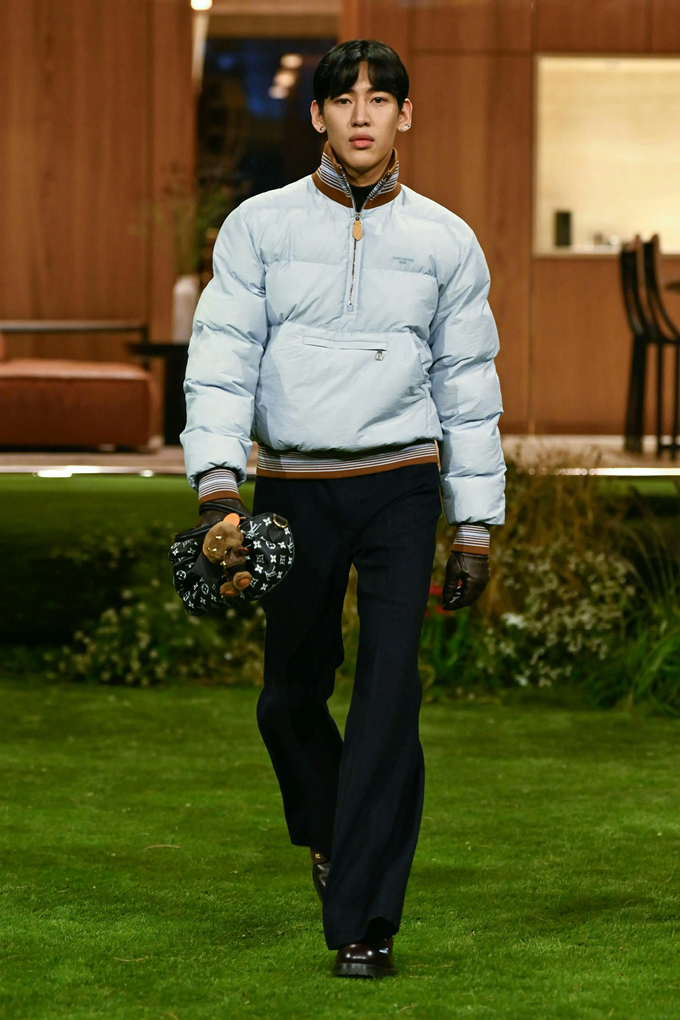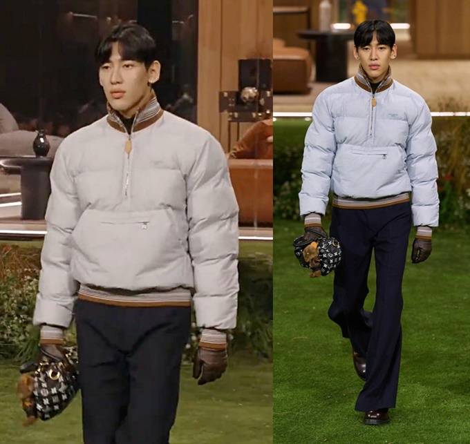 뱀뱀은 쿼터 집업 푸퍼 재킷과 블랙 팬츠를 매치한 기능적인 윈터룩으로 루이비통 재단앞에 실제 거주 공간처럼 설계된 미래의 주거 공간 ‘DROPHAUS’ 런웨이 무대를 활보하며 스포트라이트를 받았다.