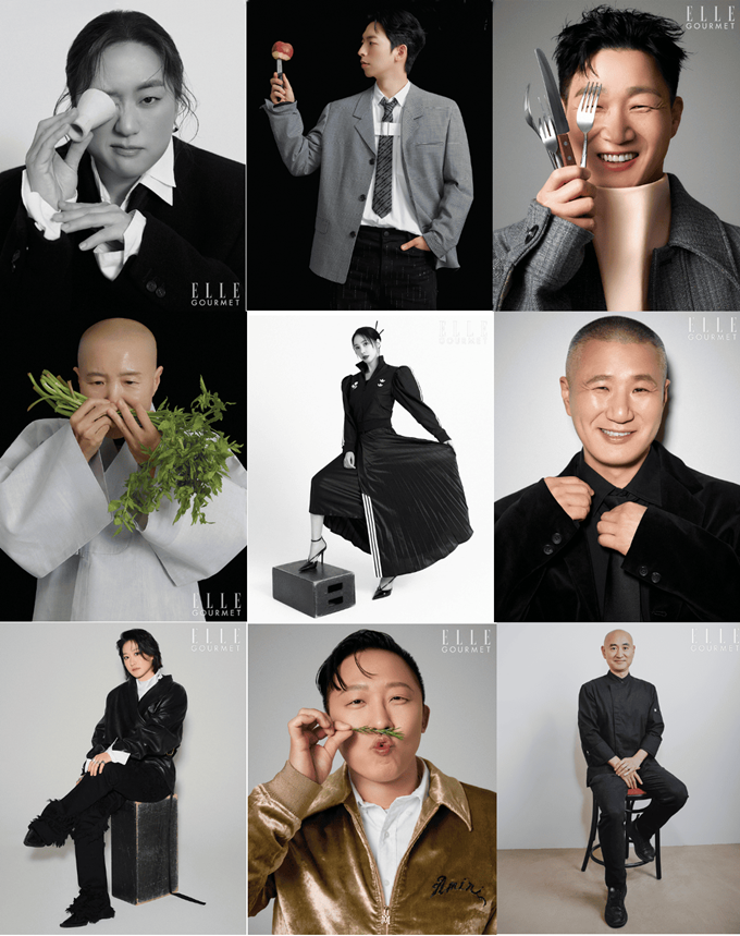 넷플릭스 시리즈 <흑백요리사: 요리 계급 전쟁 시즌2>에 참가한 셰프 9인, 선재스님, 이준, 심성철, 최유강, 김희은 그리고 ‘술빚는 윤주모’ 윤나라, ‘중식마녀’ 이문정, ‘뉴욕에 간 돼지곰탕’ 옥동식, ‘삐딱한 천재’ 이찬양이 <엘르 고메> 창간호에서 ‘흑백’의 경계를 넘어 나만의 맛을 찾아가는 여정을 볼드한 포트레이트 화보로 담아냈다.