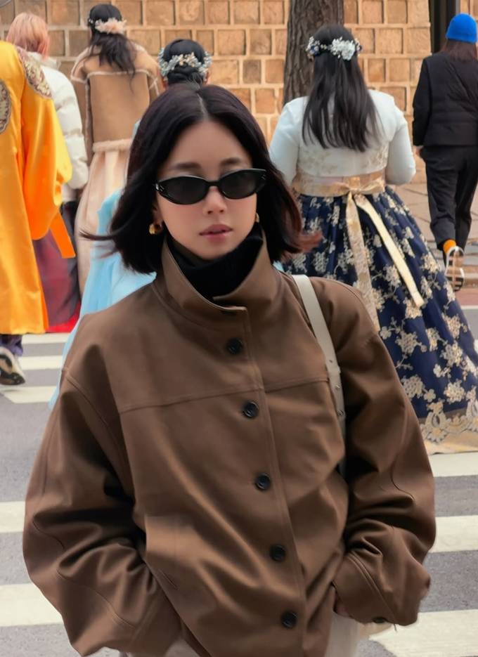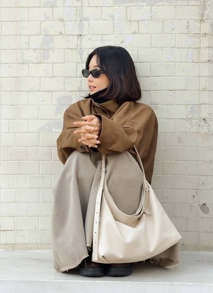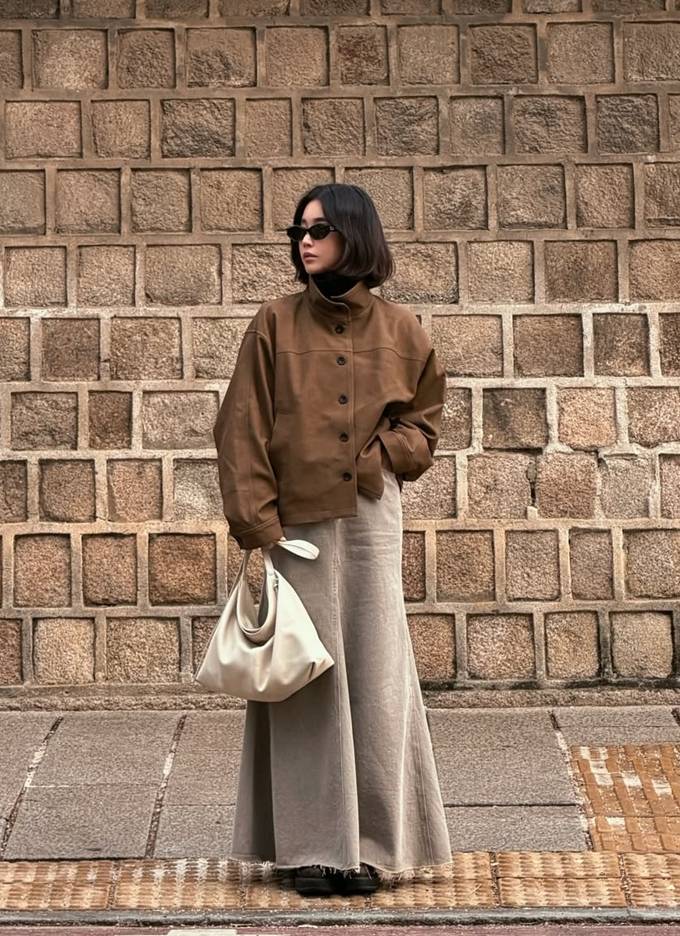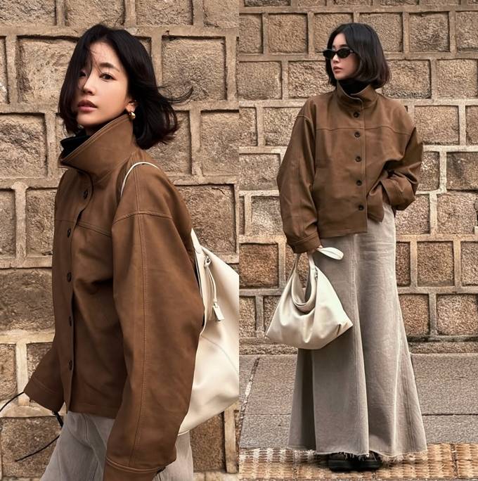 공개한 사진에서 기은세는 브라운 컬러의 하이넥 재킷에 은은한 결이 느껴지는 롱 스커트를 매치해 단정하면서도 멋스러운 간절기룩을 완성했다.
