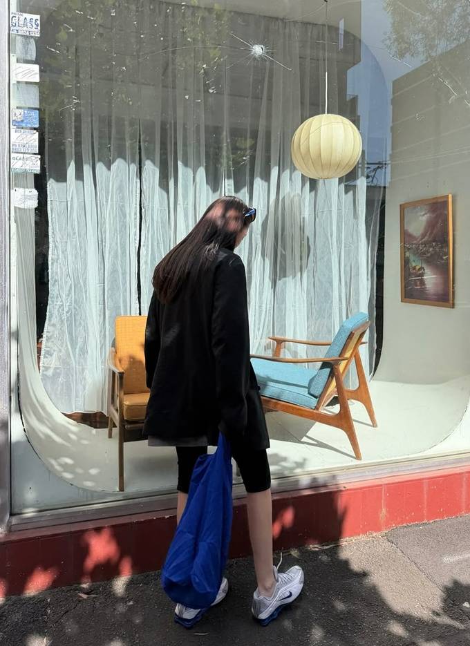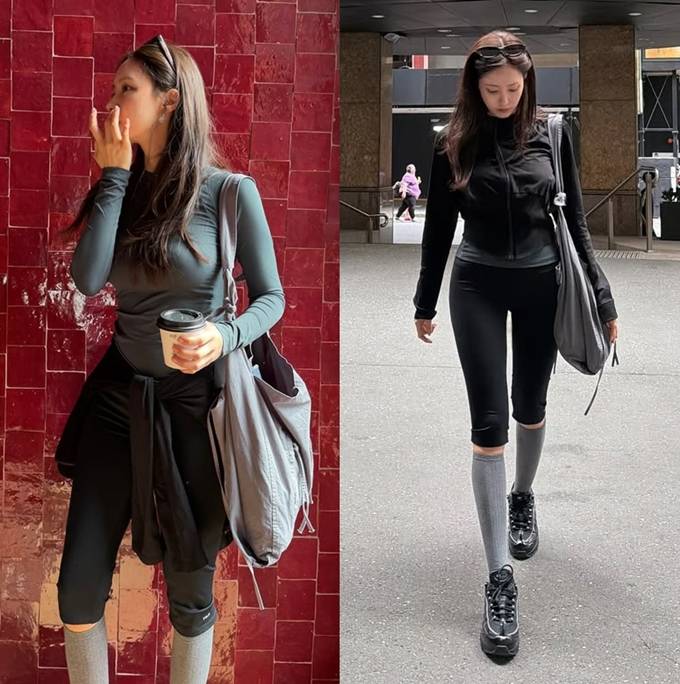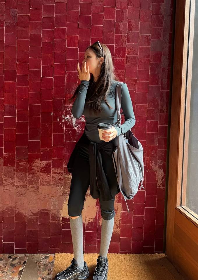 또 여기에 니삭스와 스니커즈를 매치해 슬림한 애슬레저룩을 완성했다.