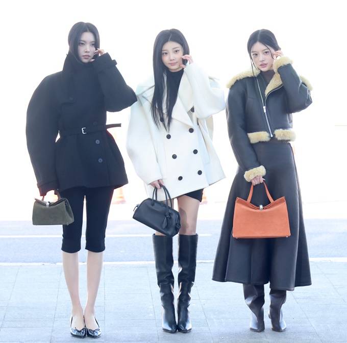 아일릿 윤아·원희·민주, 구조적인 실루엣 3인 3색 감각적인 윈티룩 파리 출국길