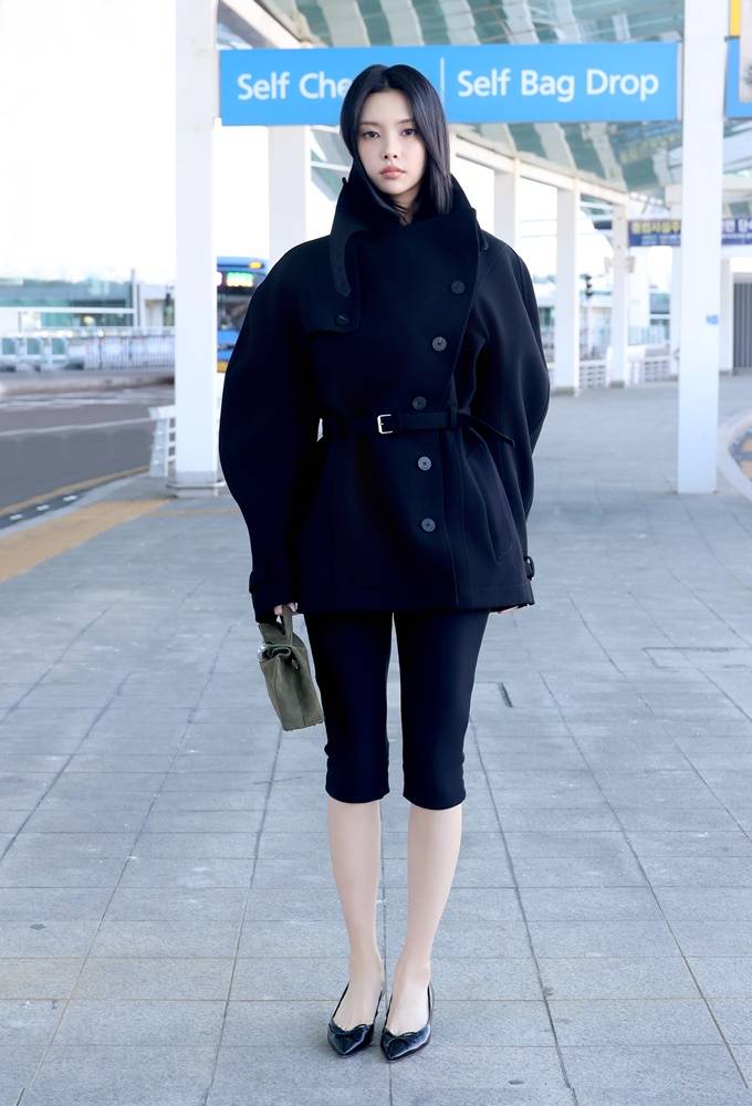 윤아는 시크하면서도 구조적인 미학이 돋보이는 벨티드 블랙 더블 브레스티드 코트와 7부 레깅스 팬츠를 매치한 세련된 공항패션 선보였다. 여기에 카키 톤의 르 발레리 (Le Valerie)백을 매치해 절제된 컬러 포인트를 더했다.