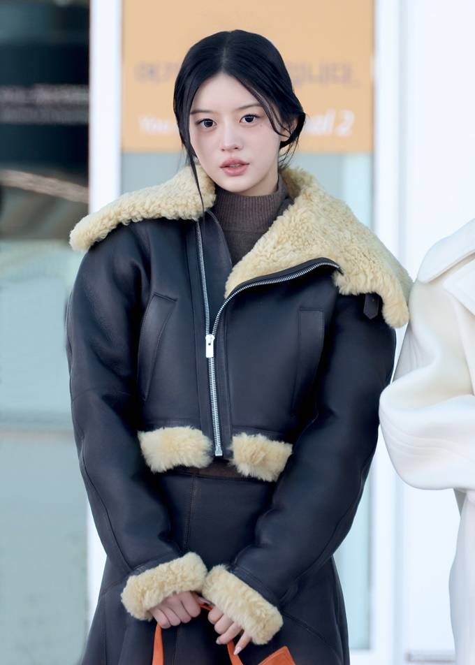민주는 포근한 감성의 클래식한 시어링 재킷과 같은 톤의 레더 스커트로 독보적인 분위기를 자아냈다. 오렌지 컬러의 르 발레리(Le Valerie) 백을 포인트로 엣지를 더했다.