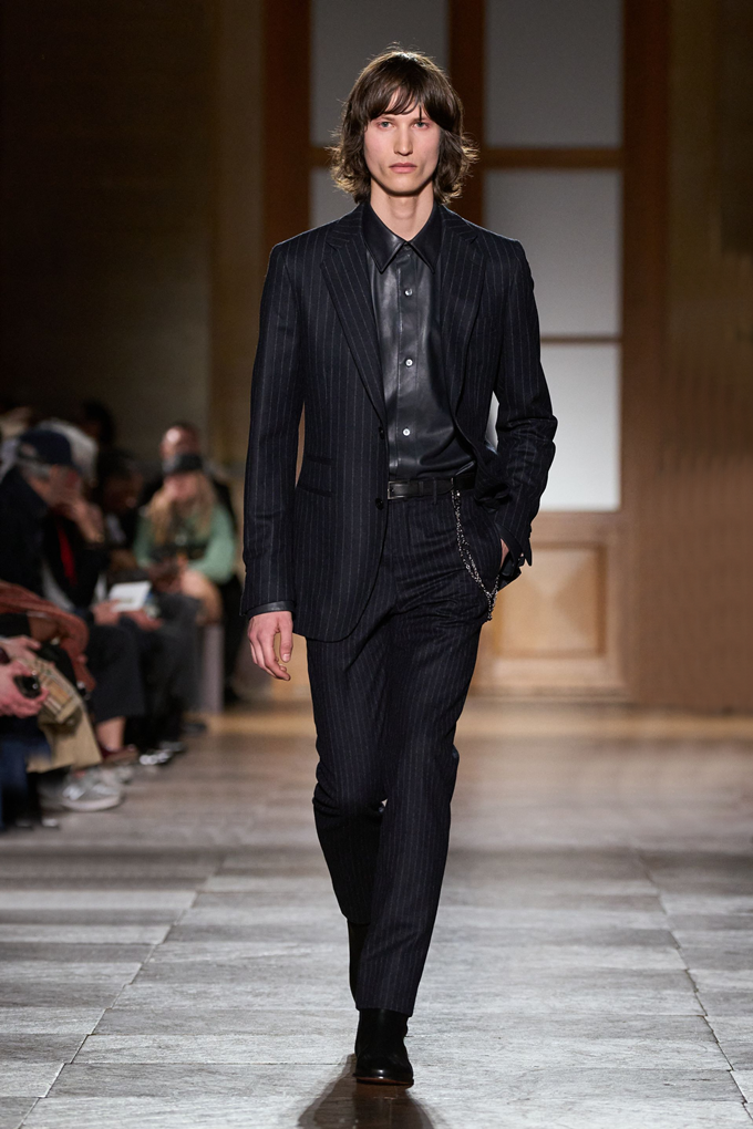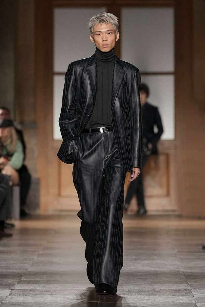 2003년의 네이비 가죽 핀스트라이프 수트와 1991년의 모카색 송아지 가죽 점프수트 등 초기 디자인을 재해석, 하우스의 과거와 현재를 조화롭게 융합했다.