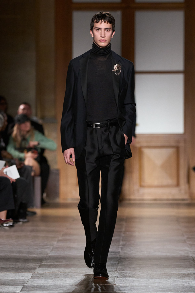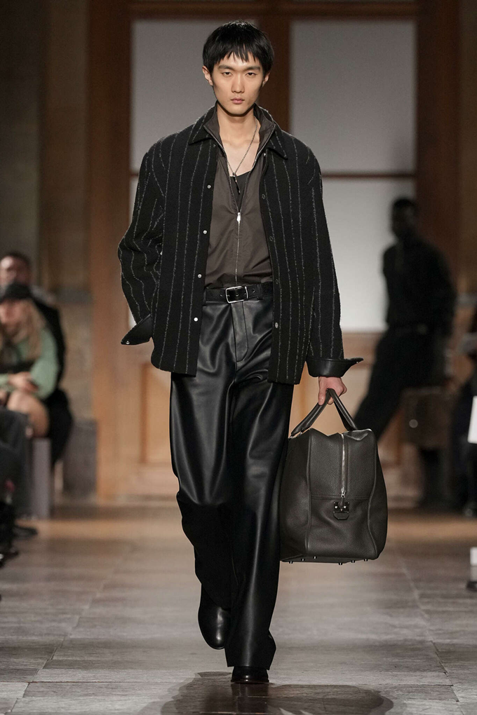 에르메스의 시그니처 소재인 송아지 가죽과 함께 고급스러운 악어 가죽, 기능성 새틴, 그리고 턱시도 스타일의 이브닝웨어에 사용된 초경량 울과 실크 페일 소재가 더해져 세련된 분위기를 완성했다.