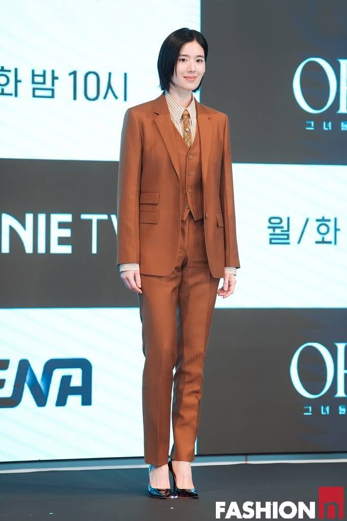 이날 정은채는 정교한 테일러링이 돋보이는 브라운 컬러의 재킷과 팬츠, 베스트까지 갖춘 쓰리피스 수트를 완벽하게 소화했다.