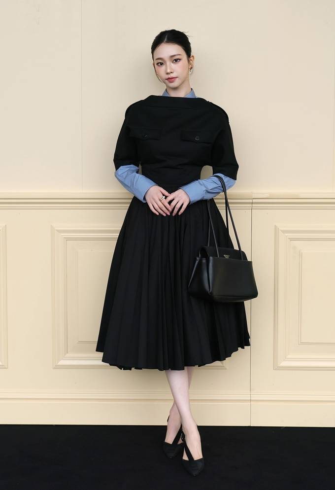 2. 에스파 카리나는 밀라노 패션위크  '프라다(PRADA)' 2026 F/W남성복 패션쇼에서 개버딘 드레스와 블루 셔츠를 매치한 우아한 패션위크 스타일을 연출했다.