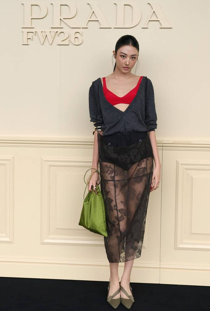 3. 미야오 가원은 밀라노 패션위크  '프라다(PRADA)' 2026 F/W 남성복 컬렉션에서 레드 브라 탑과 브이넥 니트, 시스루 스커트로 관능적인 패션위크 스타일을 연출했다.