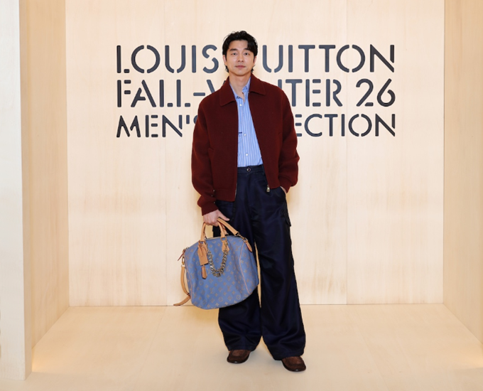 8. 배우 공유는 파리 패션위크 루이비통 F/W 남성복 컬렉션에 참석 퍼플 봄버 재킷과 팬츠를 매치한 기능적인 럭셔리룩을 선보였다.