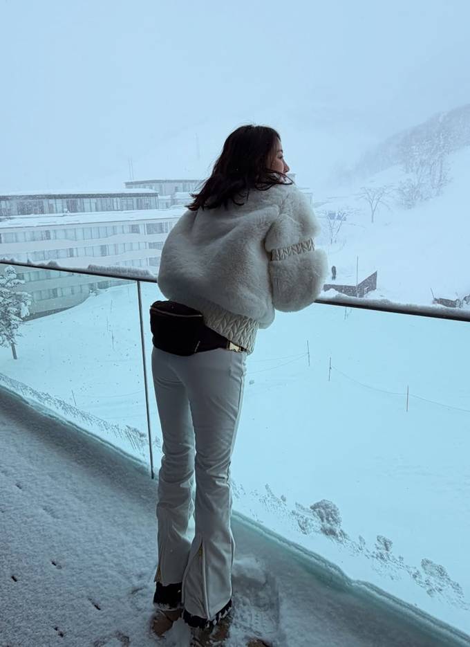 공개한 사진에서 전혜빈은 짧은 기장에 풍성한 볼륨감이 돋보이는 화이트 퍼 패딩 재킷에 슬림한 화이트 팬츠를 매치해 전체적인 비율이 한층 더 길어 보이는 스키룩을 완성했다.